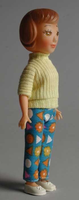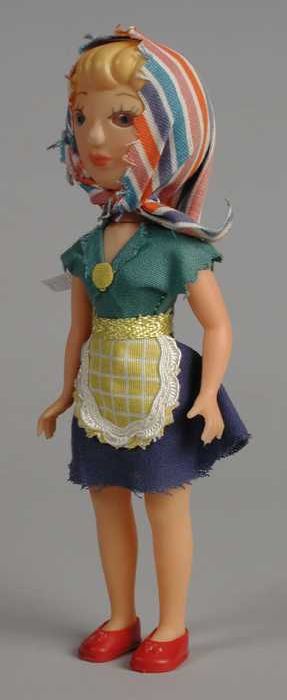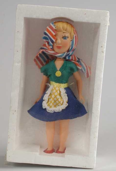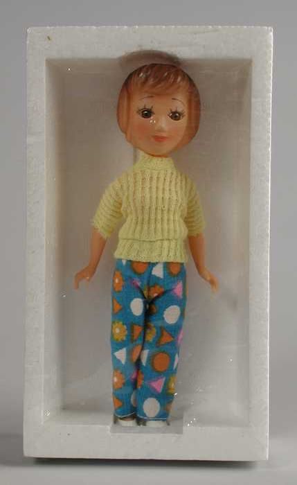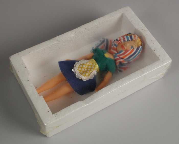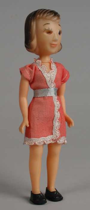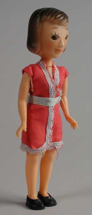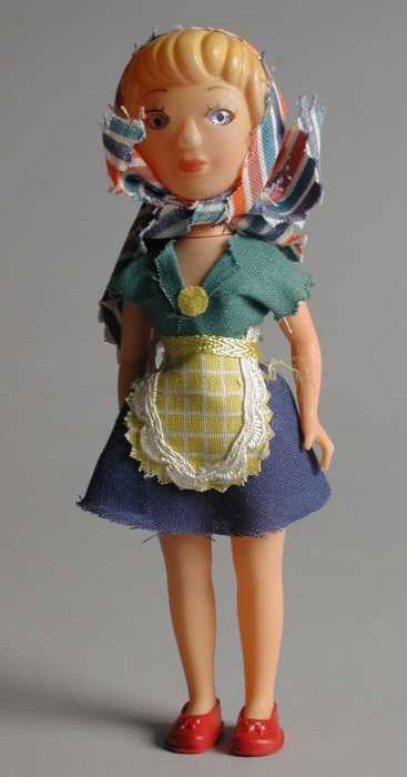 Kleine pop van roze gekleurd plastic, gekleed in bla...