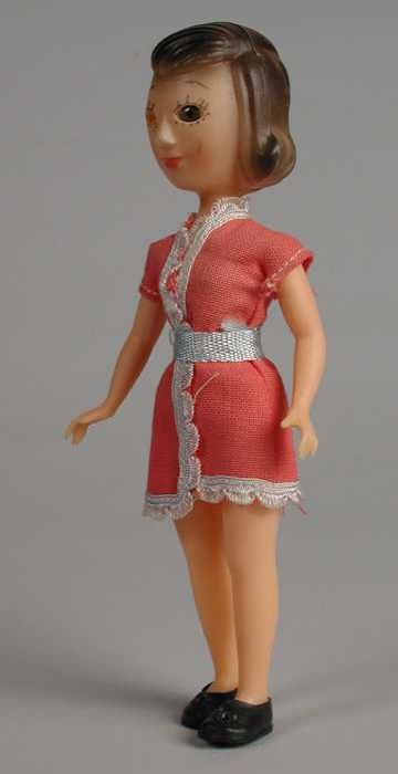 Kleine pop van roze gekleurd plastic, gekleed in roz...