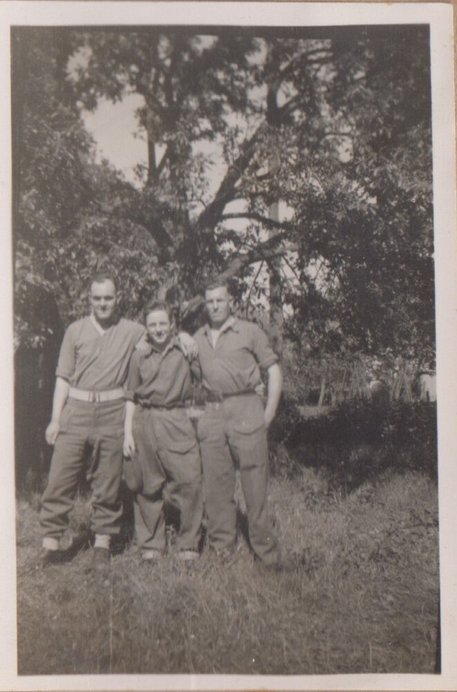 Foto van drie militairen voor struikgewas en bomen