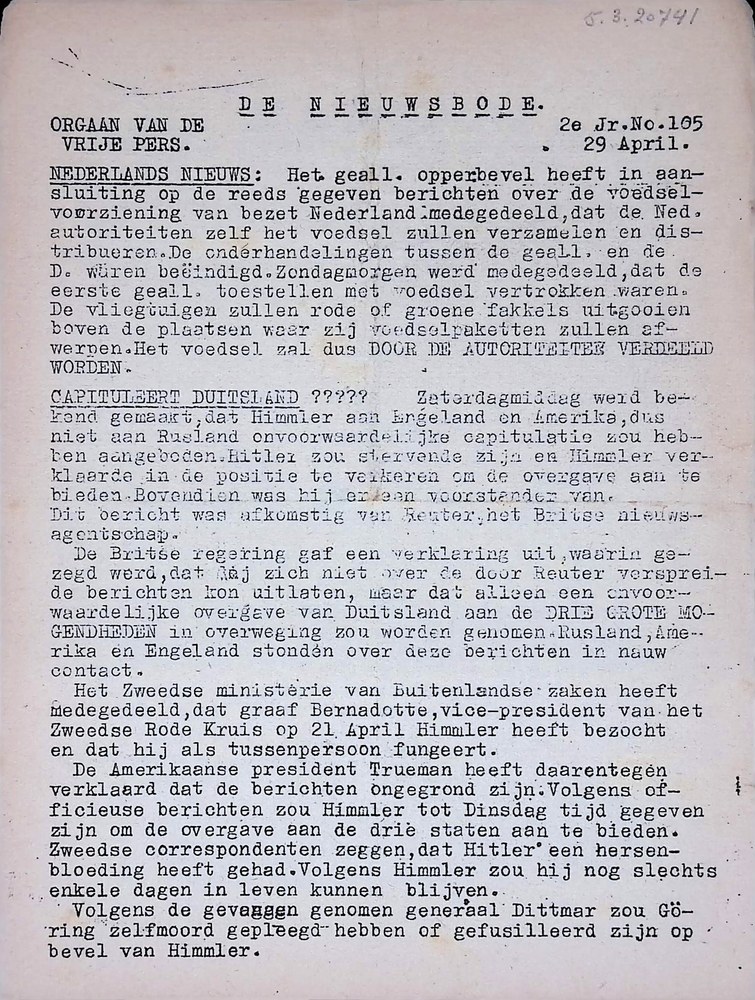 De Nieuwsbode, no. 105, 29 april 1945