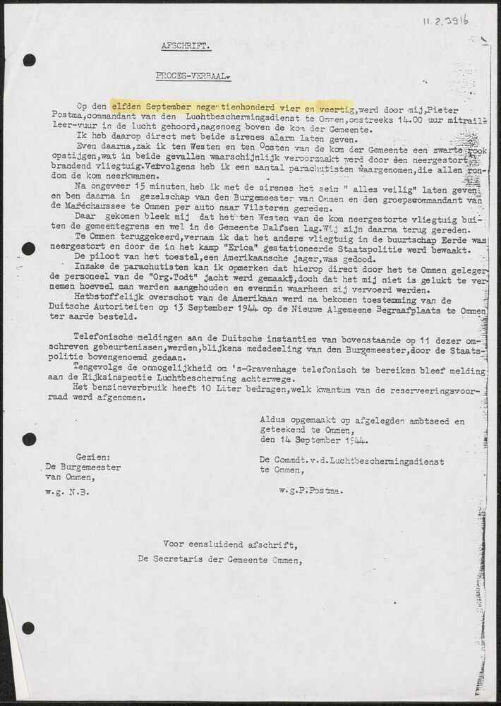 Proces-Verbaal Luchtbeschermingsdienst, Ommen 14 sep...