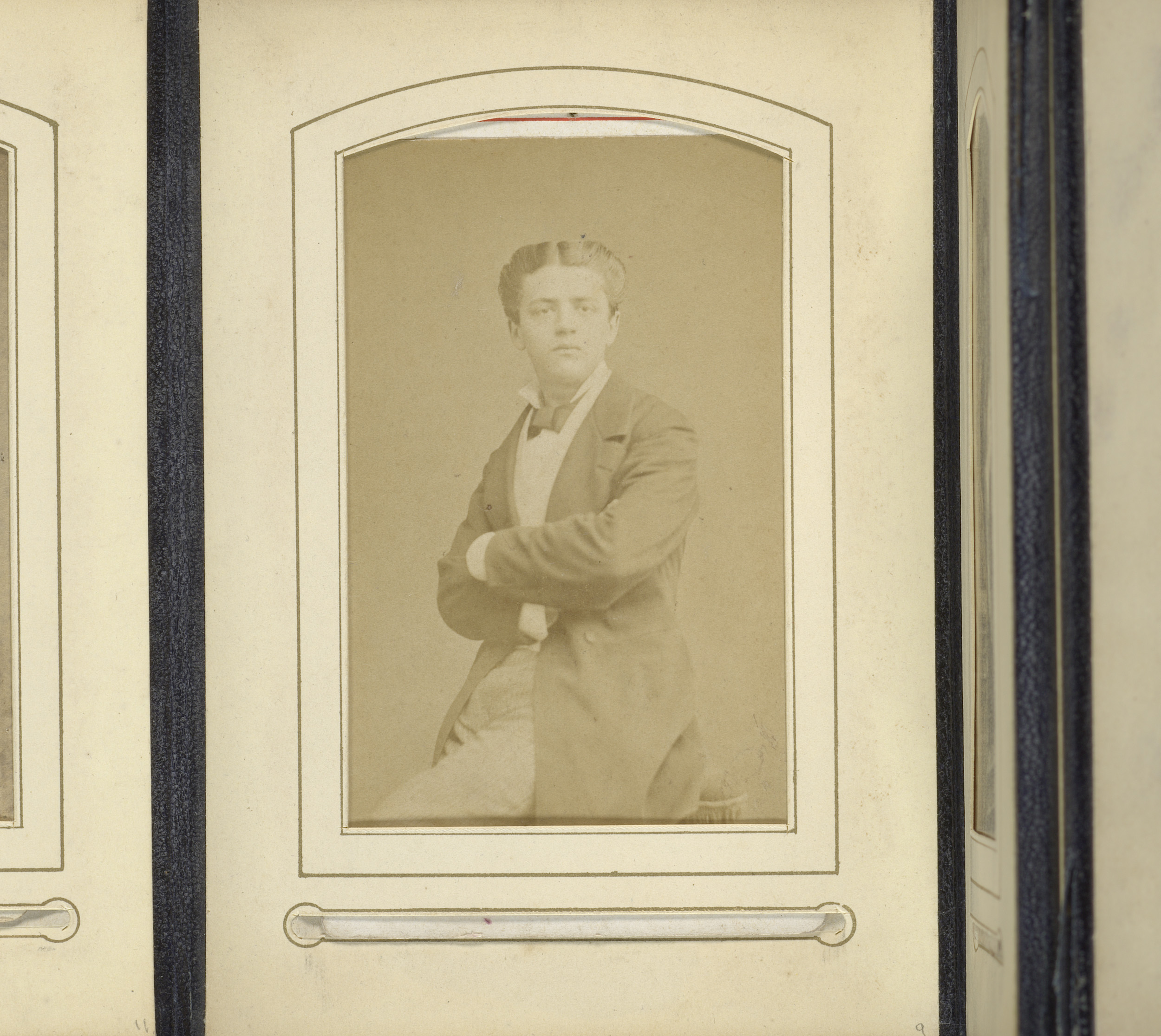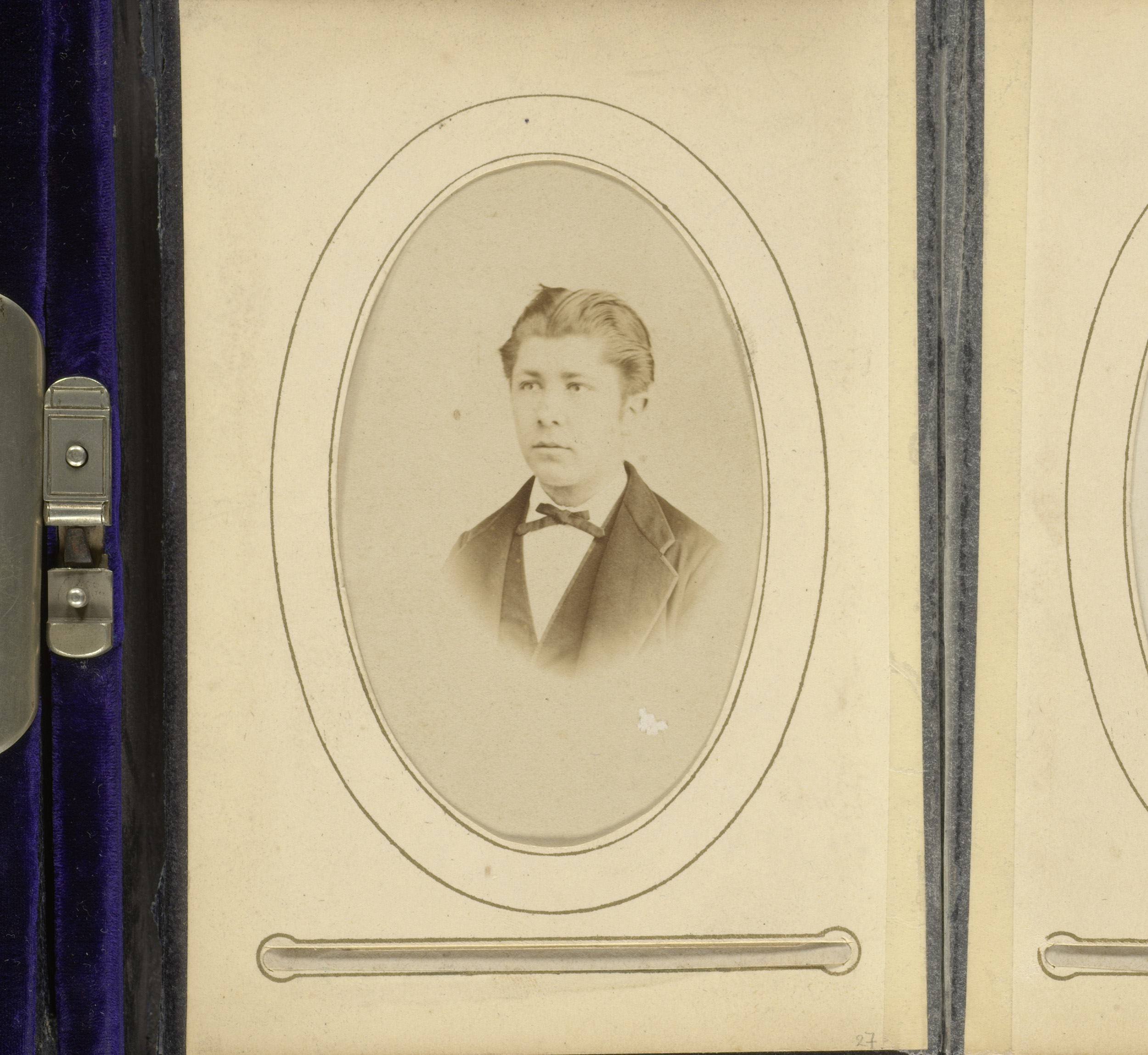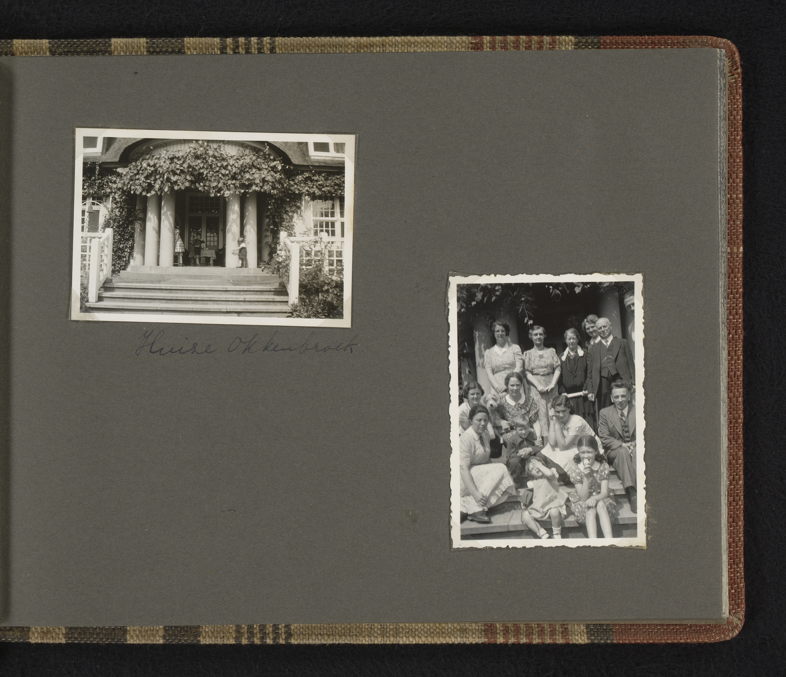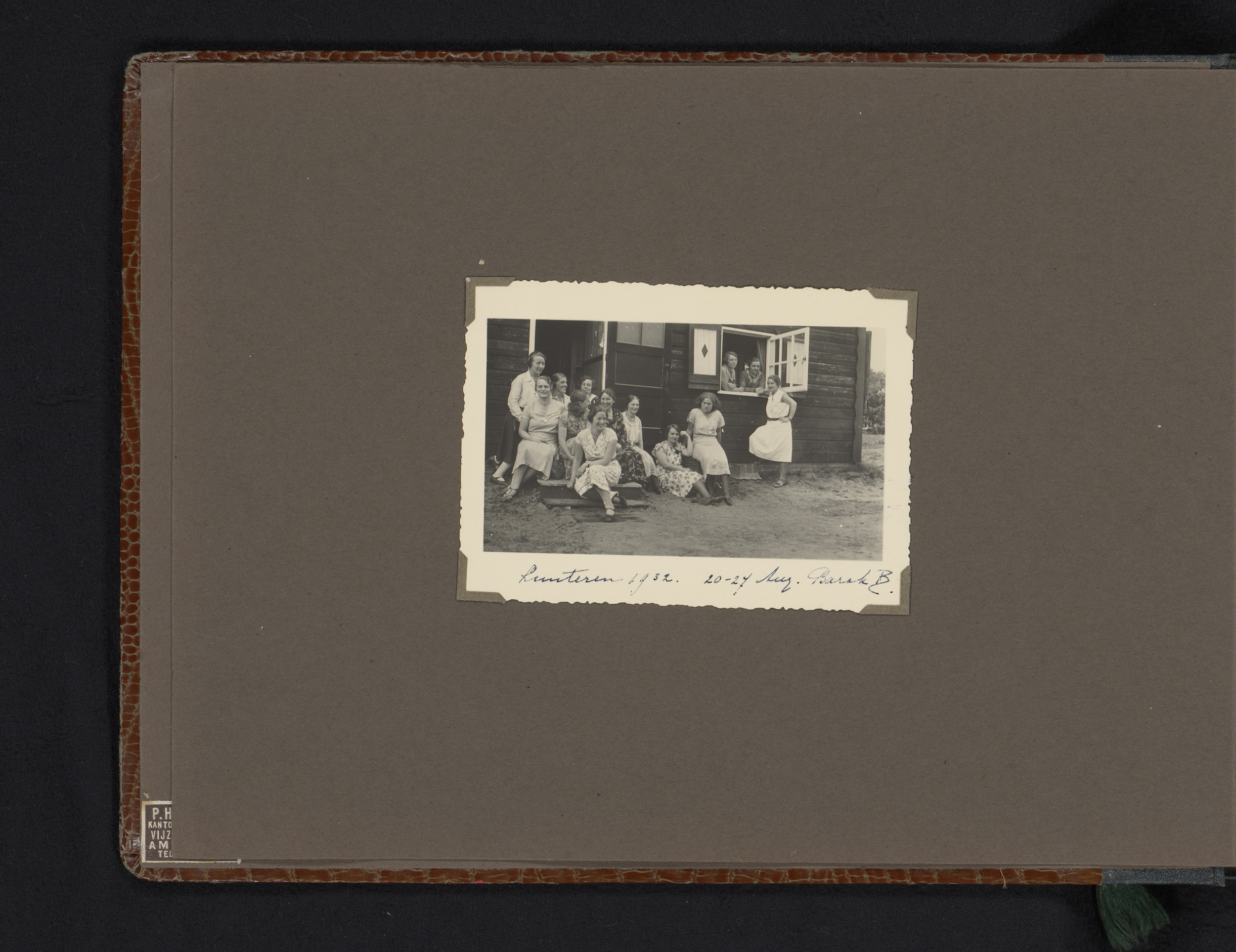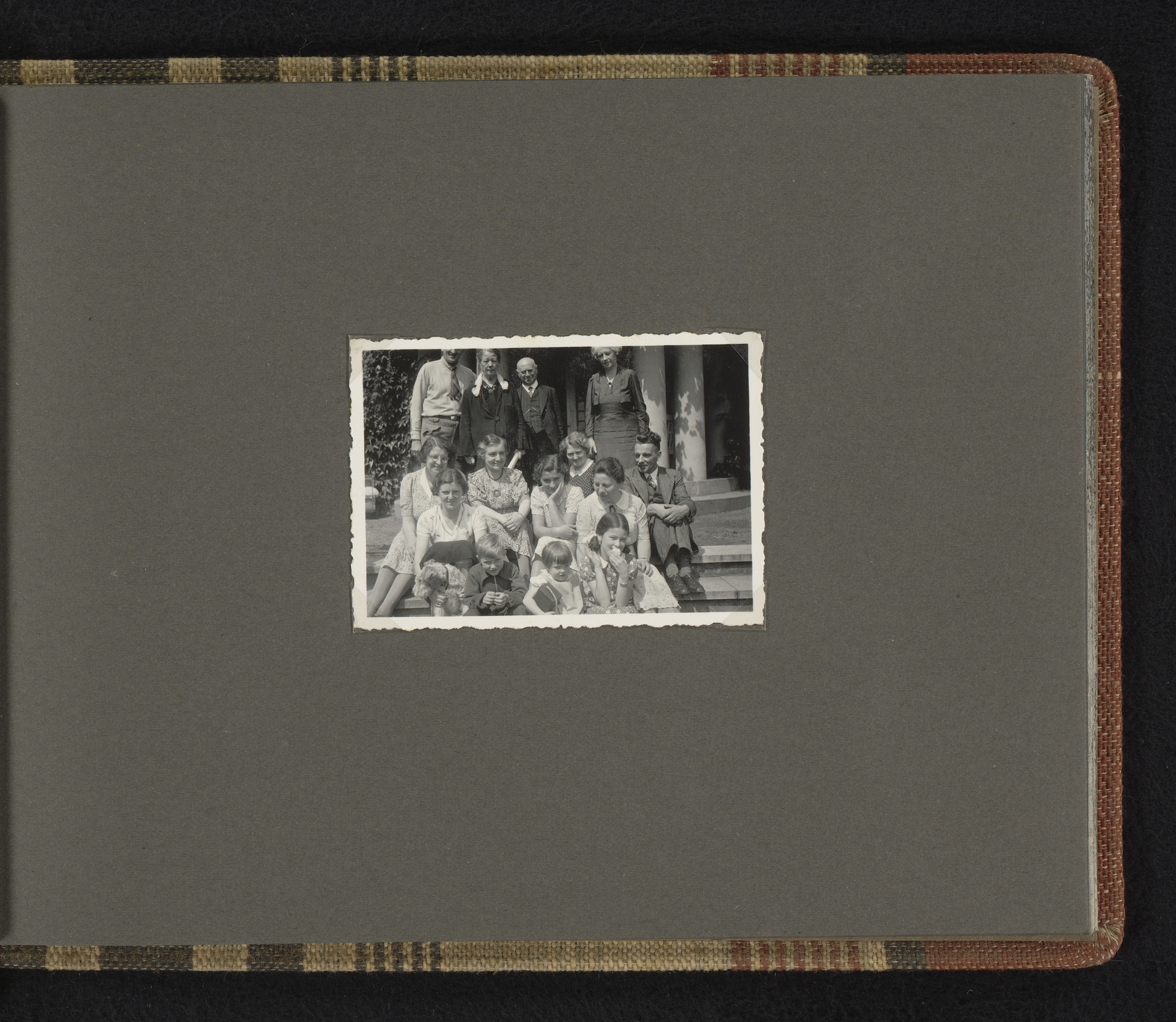 Groepsportret van jonge mannen en voruwen tussen twe...