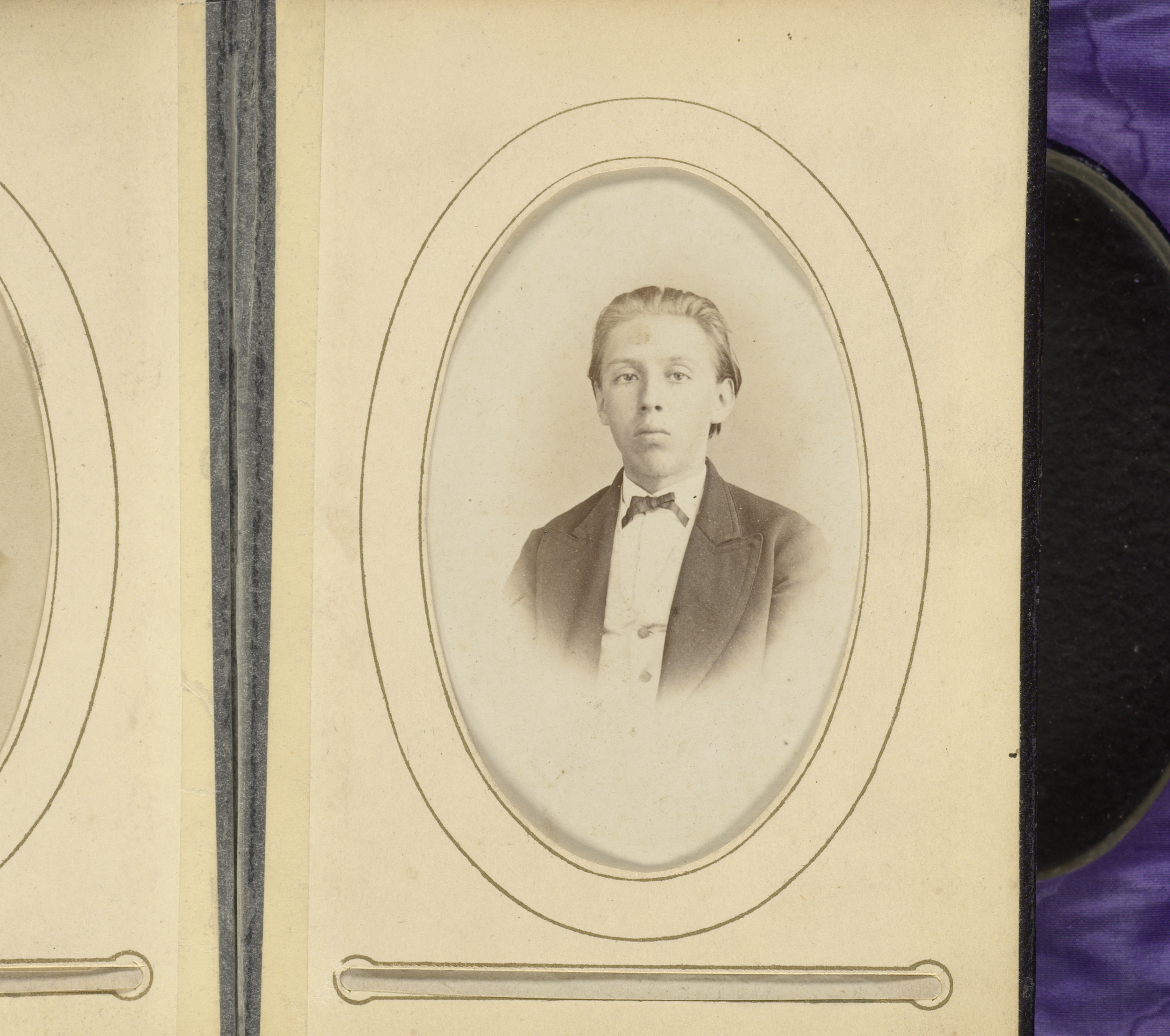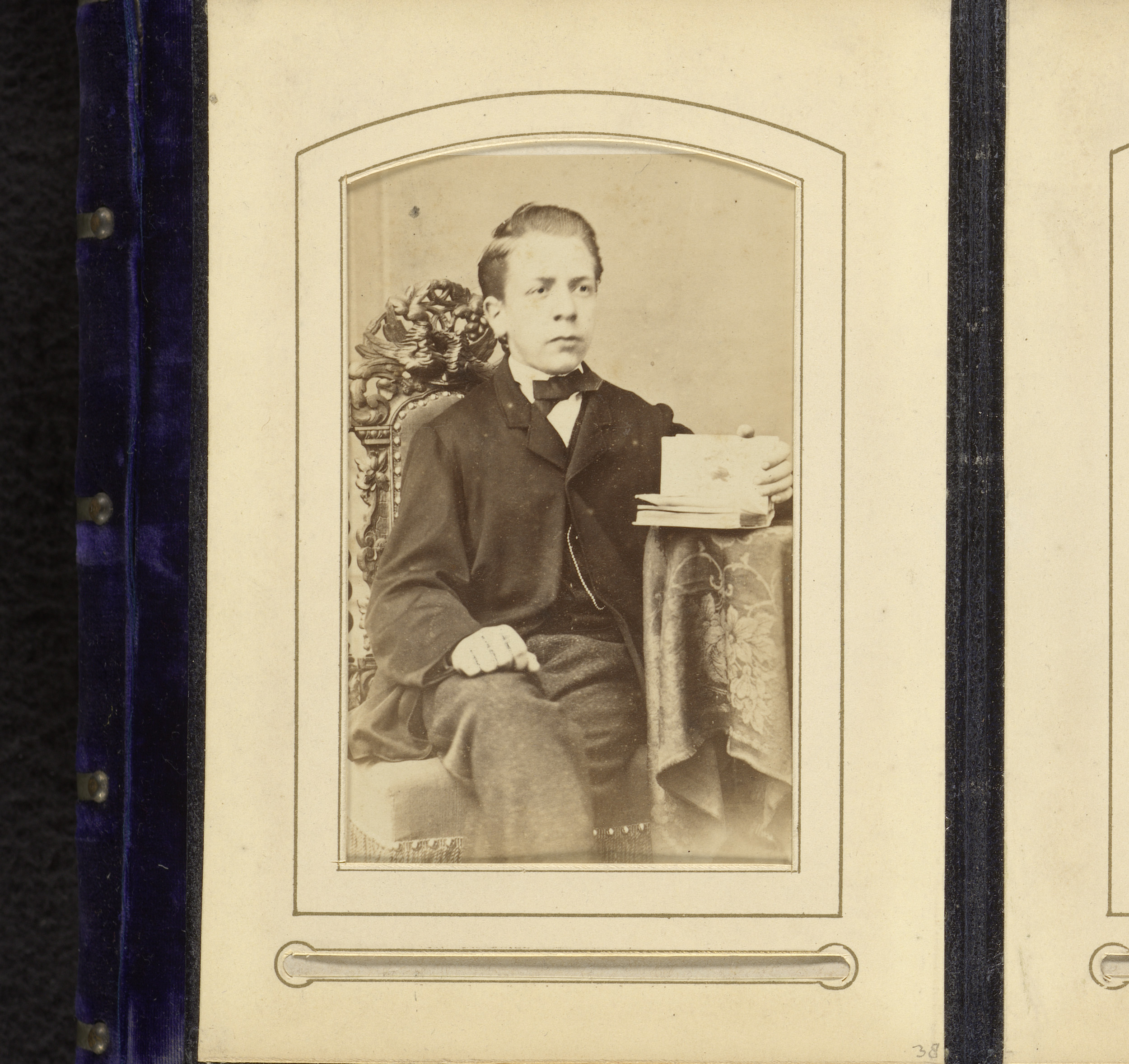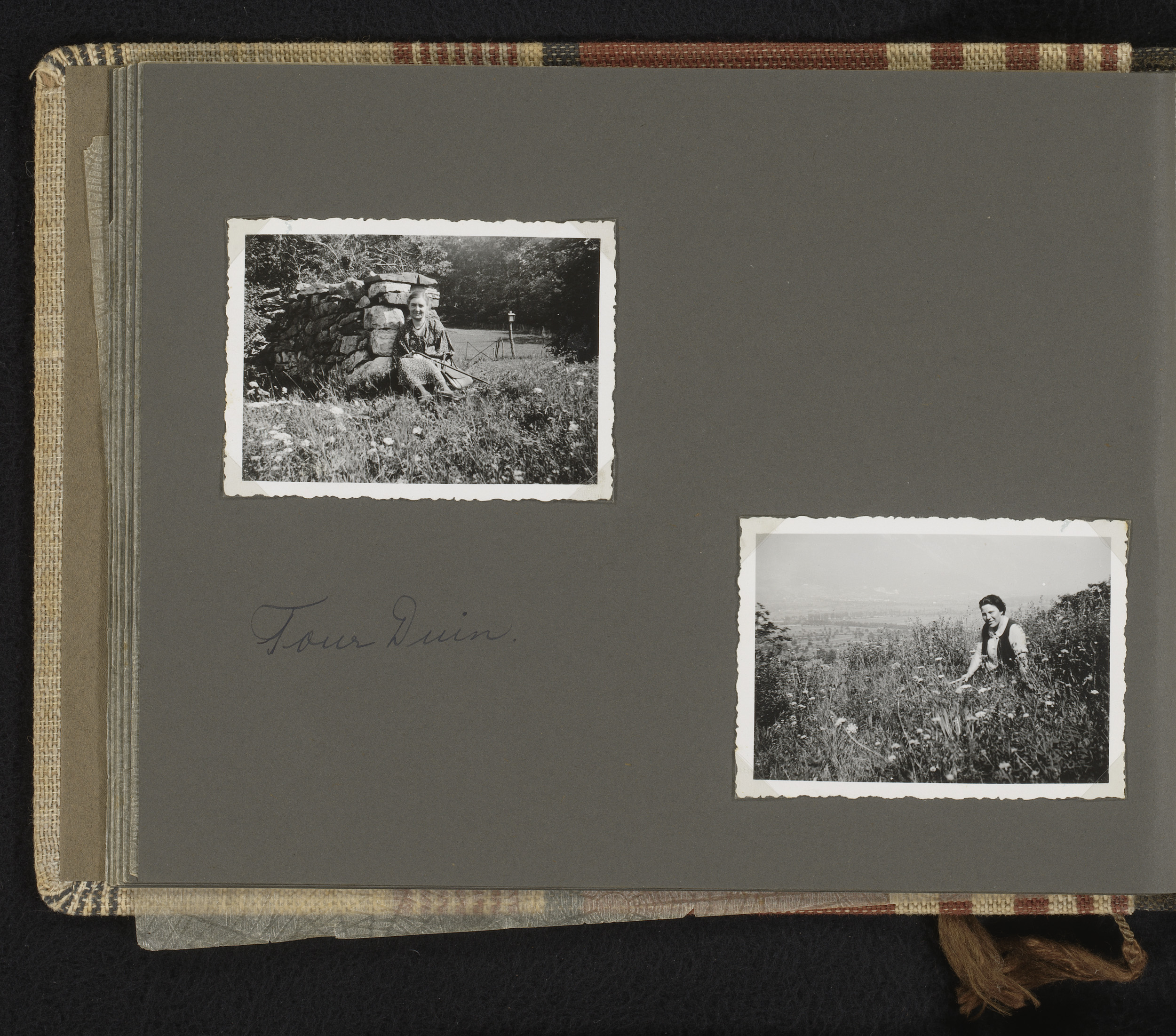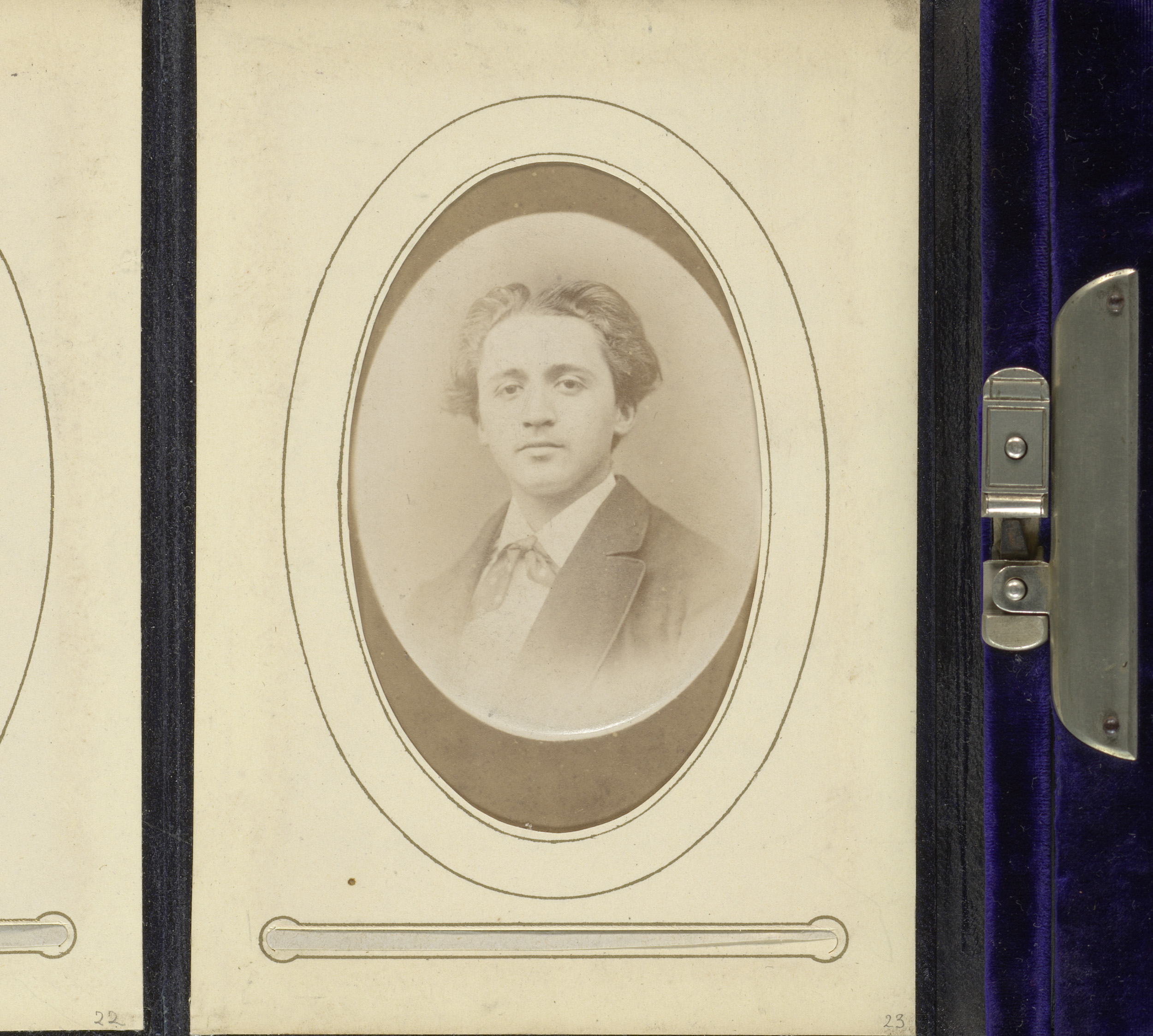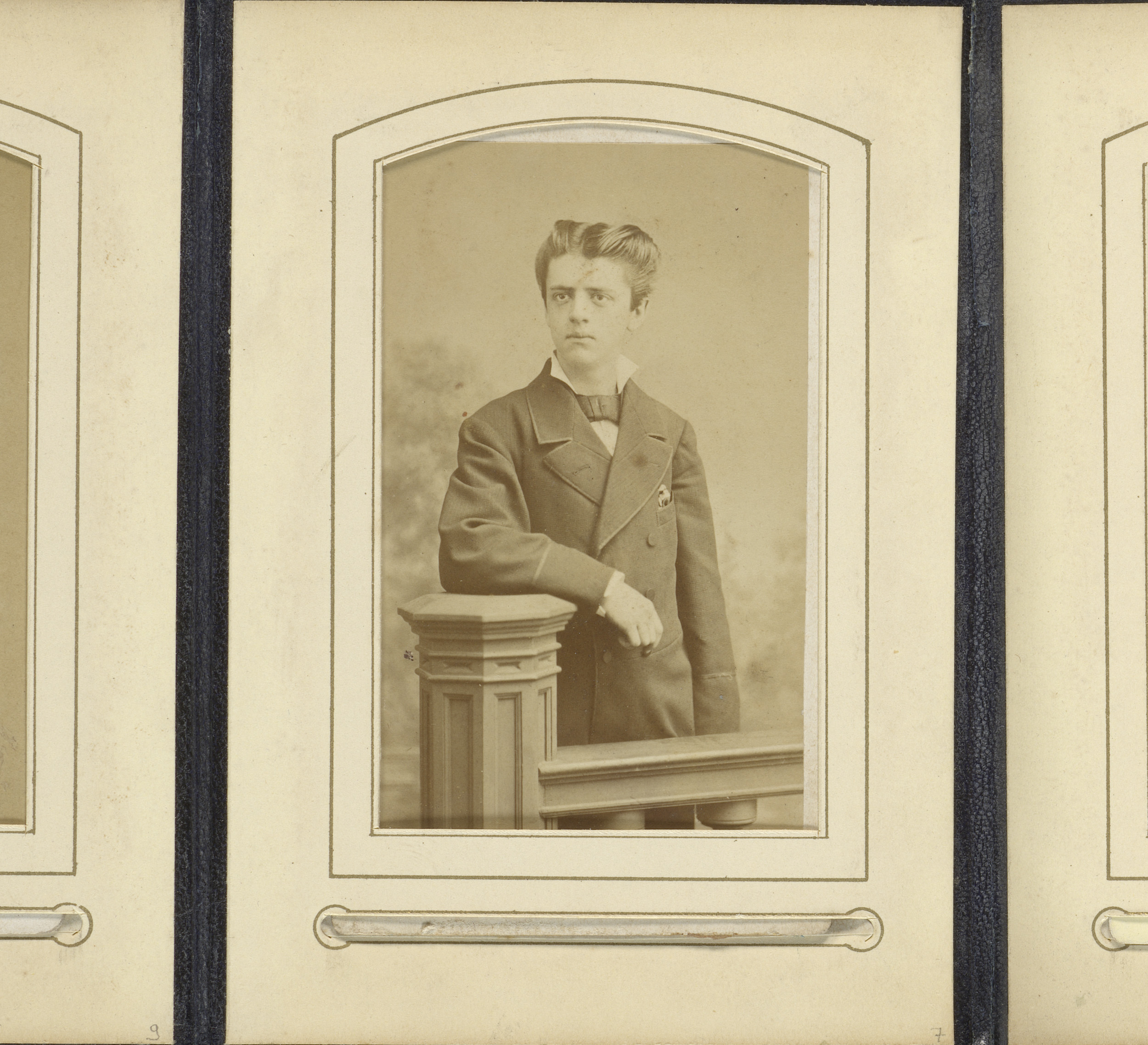 Groepsportret van jonge mannen en voruwen tussen twe...