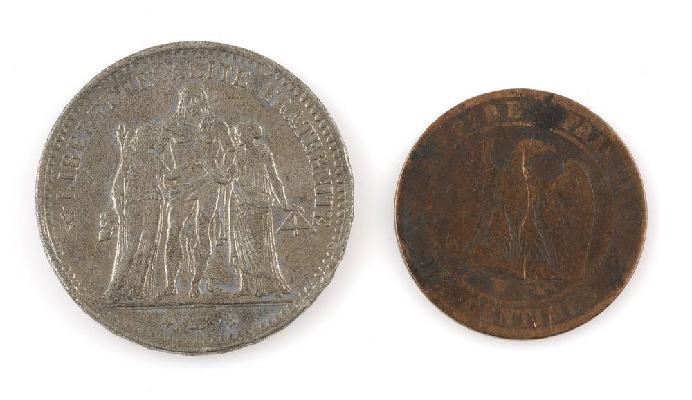 twee munten: 5 Francs 1875 en 10 centimes 1856