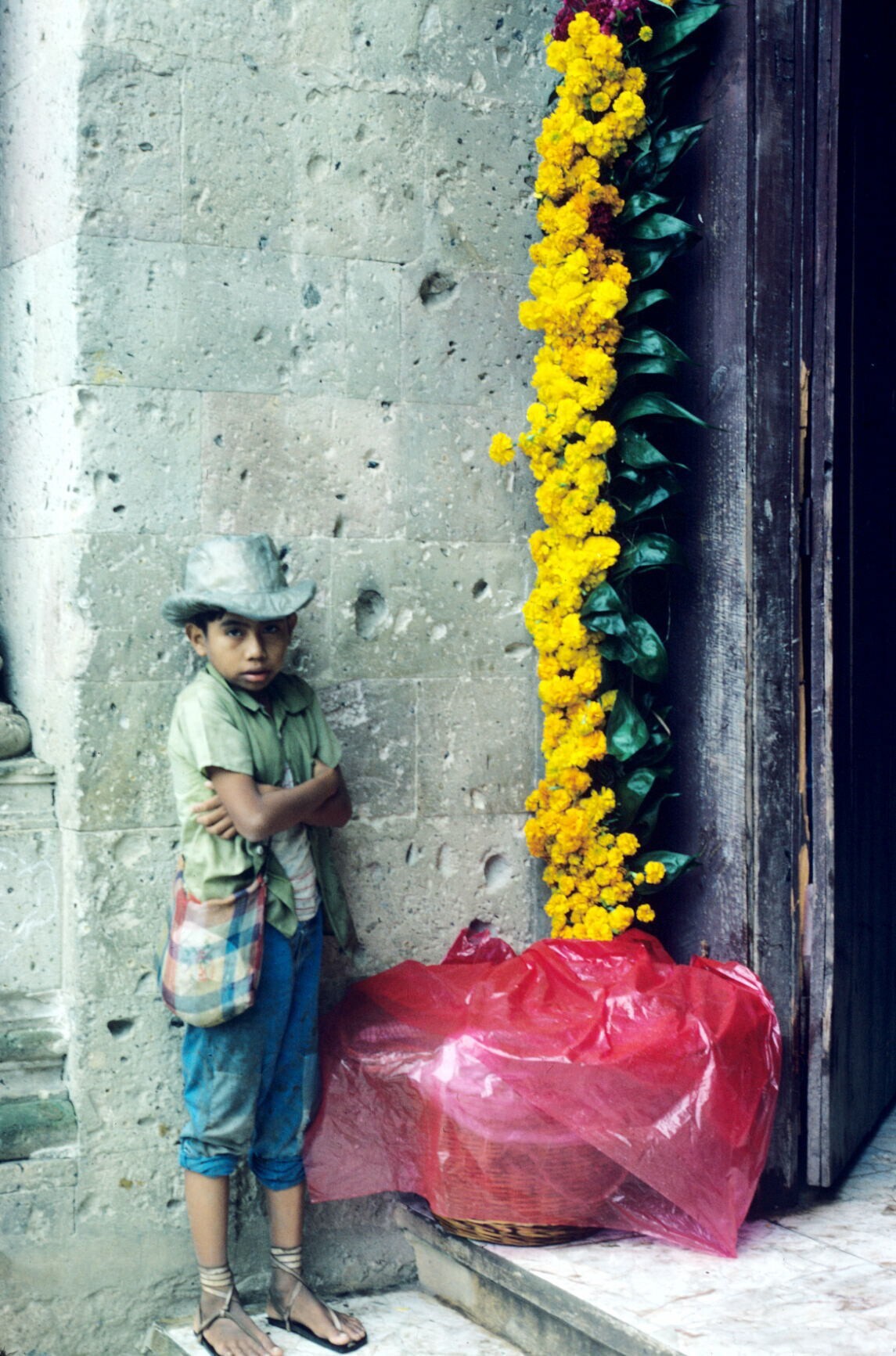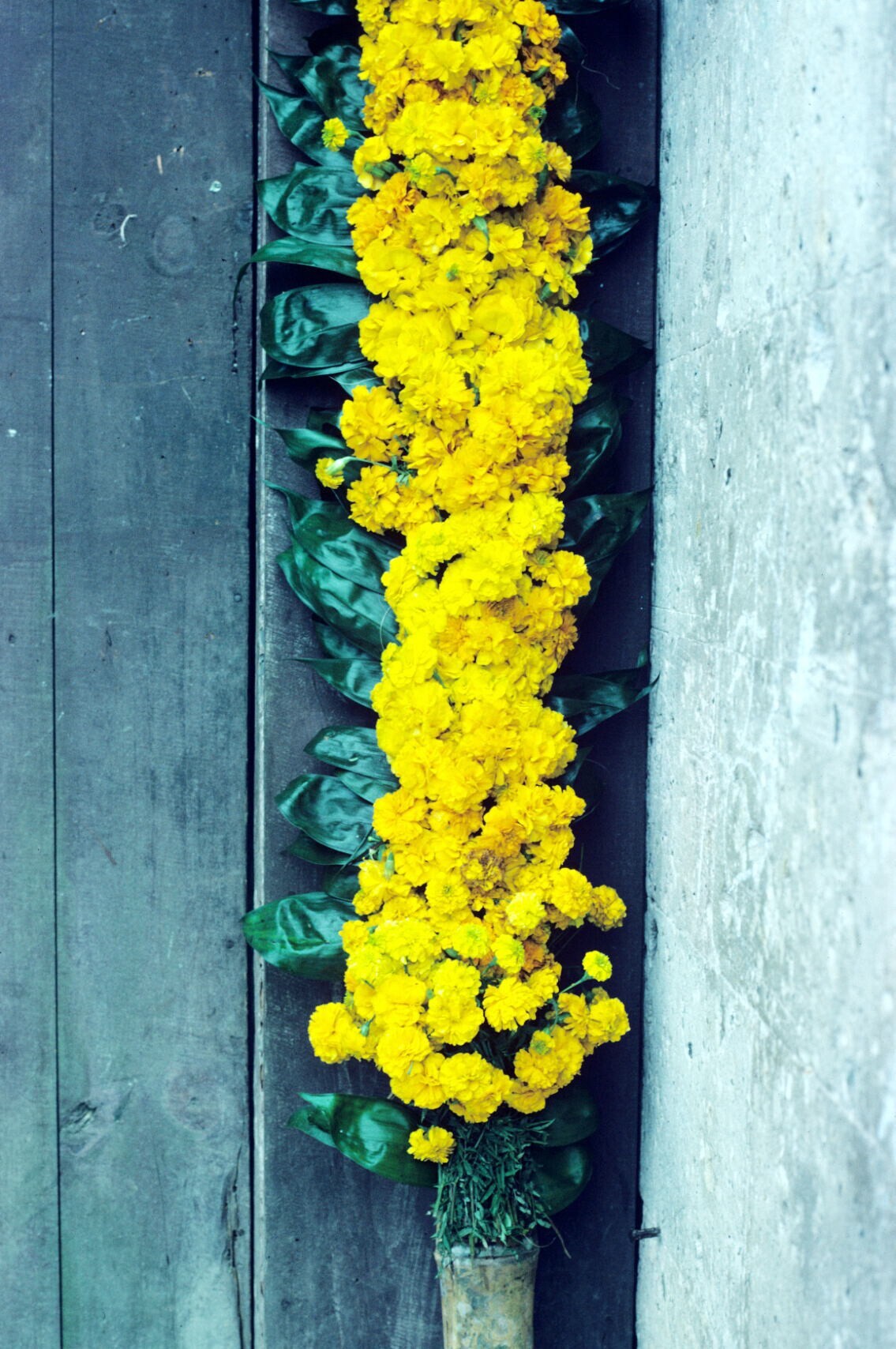 slinger van cempaxochitl (afrikanen) bij kerkingang ...
