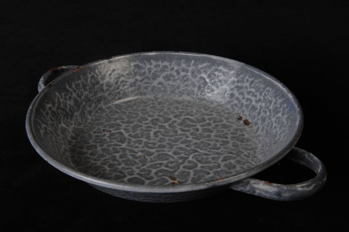 Klein grijs gewolkt geëmailleerd pannetje, met schui...