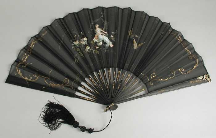 Zwarte vouwwaaier met vrouw op bloesemtak met vlinders