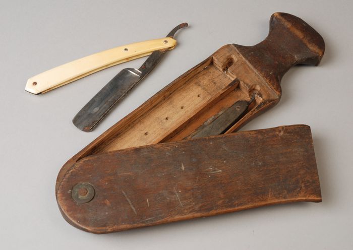 Twee scheermessen in een zwaardvormige houten opberg...