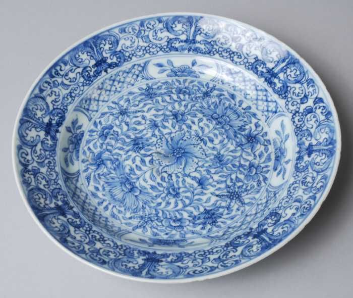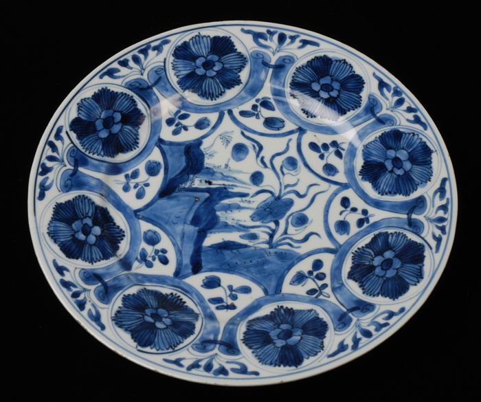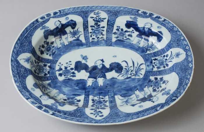 Ovale porseleinen schotel met in blauw Aziatisch fig...