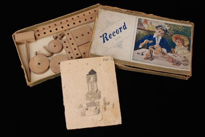 Bouwdoos "Record", kartonnen doosje met houten schij...