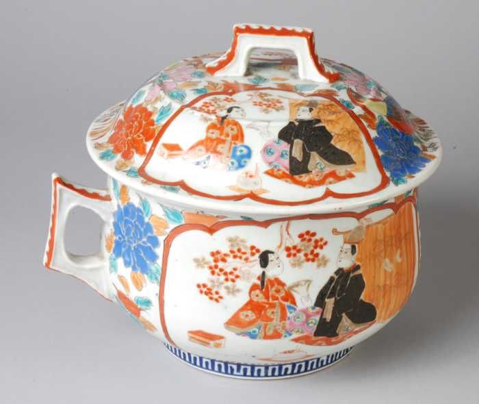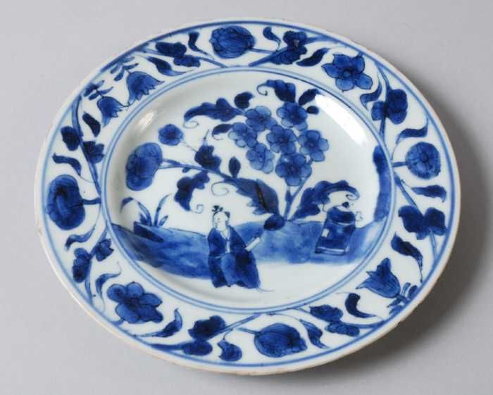 Witte schotel met in blauw Aziatisch figuur en bloemen
