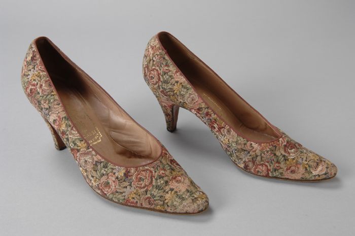 Gebloemde gobelin pumps in oud-roze- en groen-tinten...