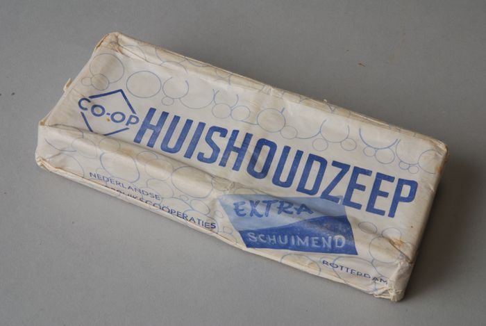 In papier verpakte "Co-op, huishoudzeep", wit en blauw