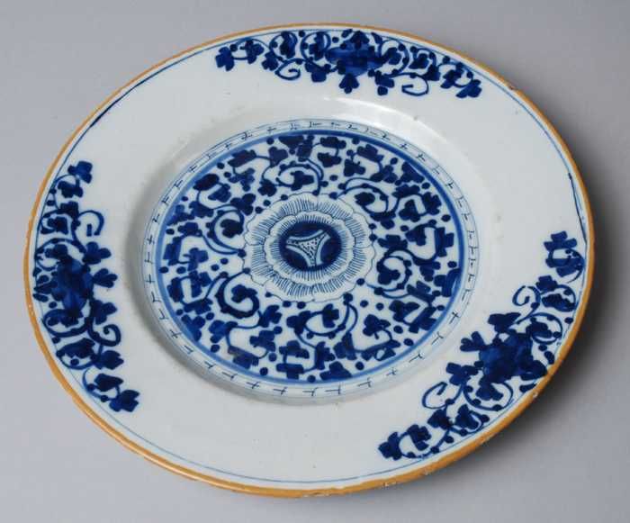 Wit bord met blauw bloemmotief en bruine rand, Delft...