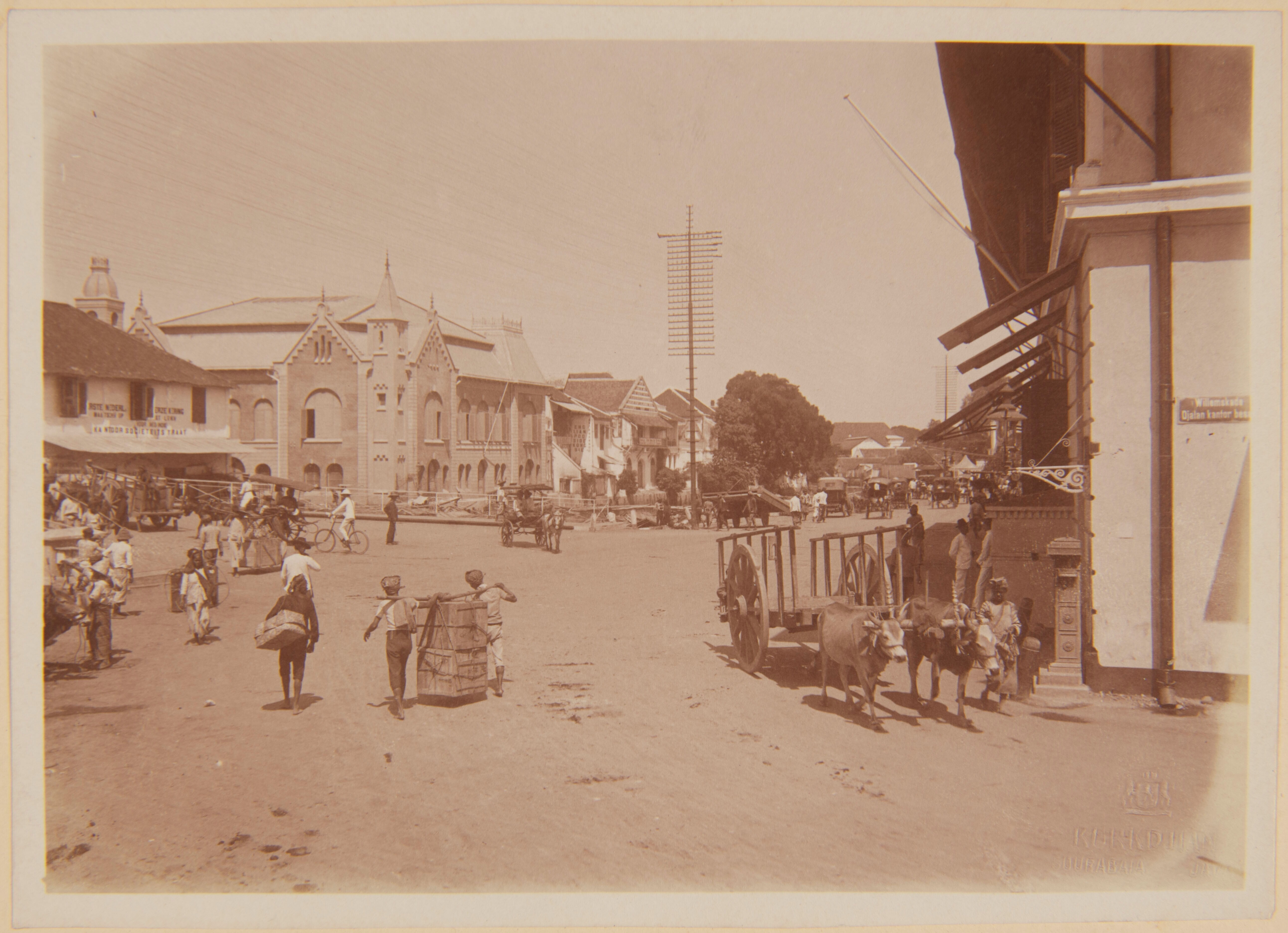 Plein met karren, mensen die vracht dragen, centraal...