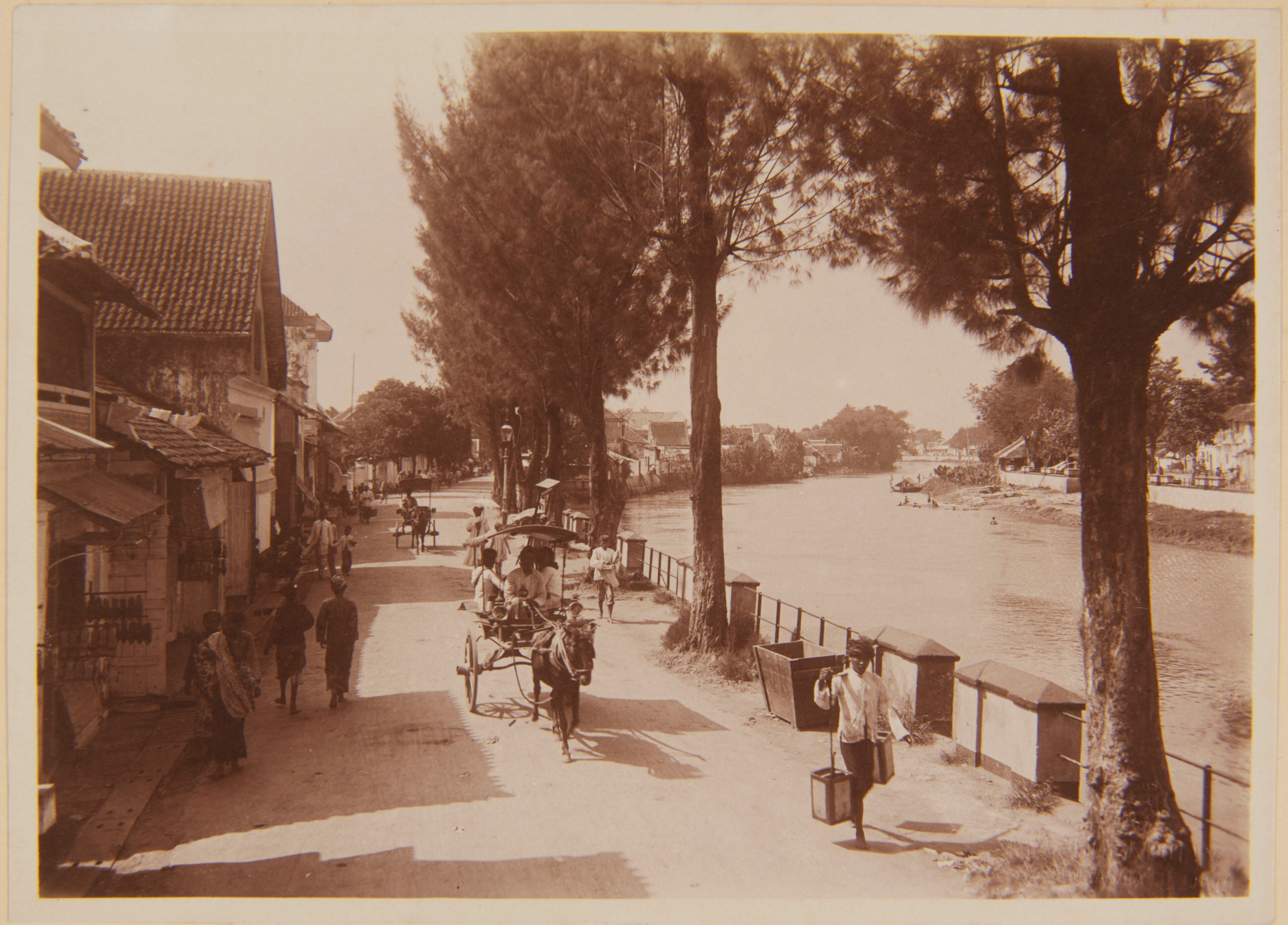 Straatbeeld langs een rivier met koetsen en voetgangers