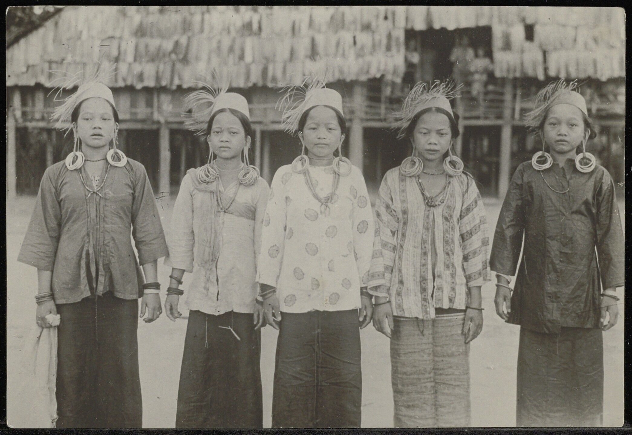 Portret van jonge Kajan Dajak vrouwen in feesttenue ...