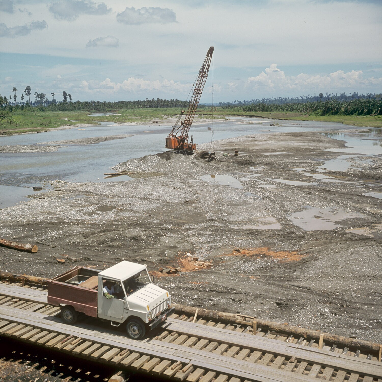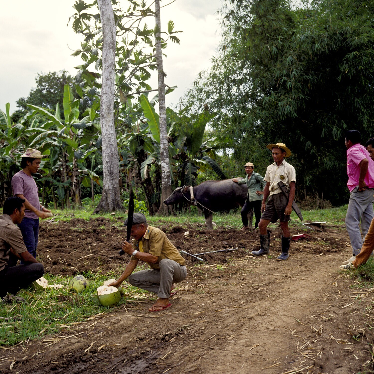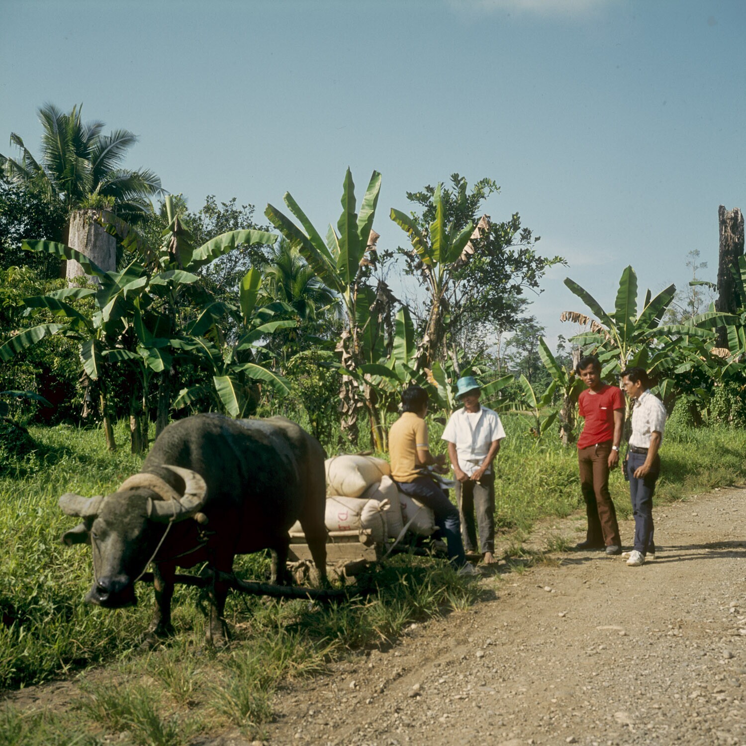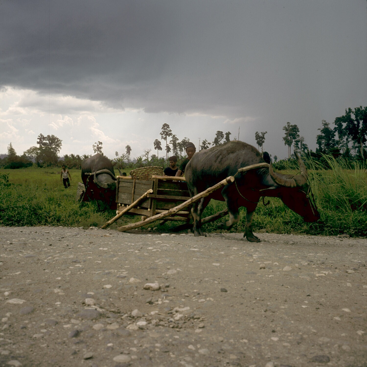 Karbouwen trekken hout bij Basa, Simuloa rivier proj...