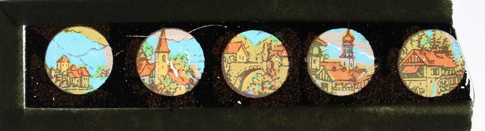 3 toverlantaarnplaatjes met 5 door zwart omgeven, ci...