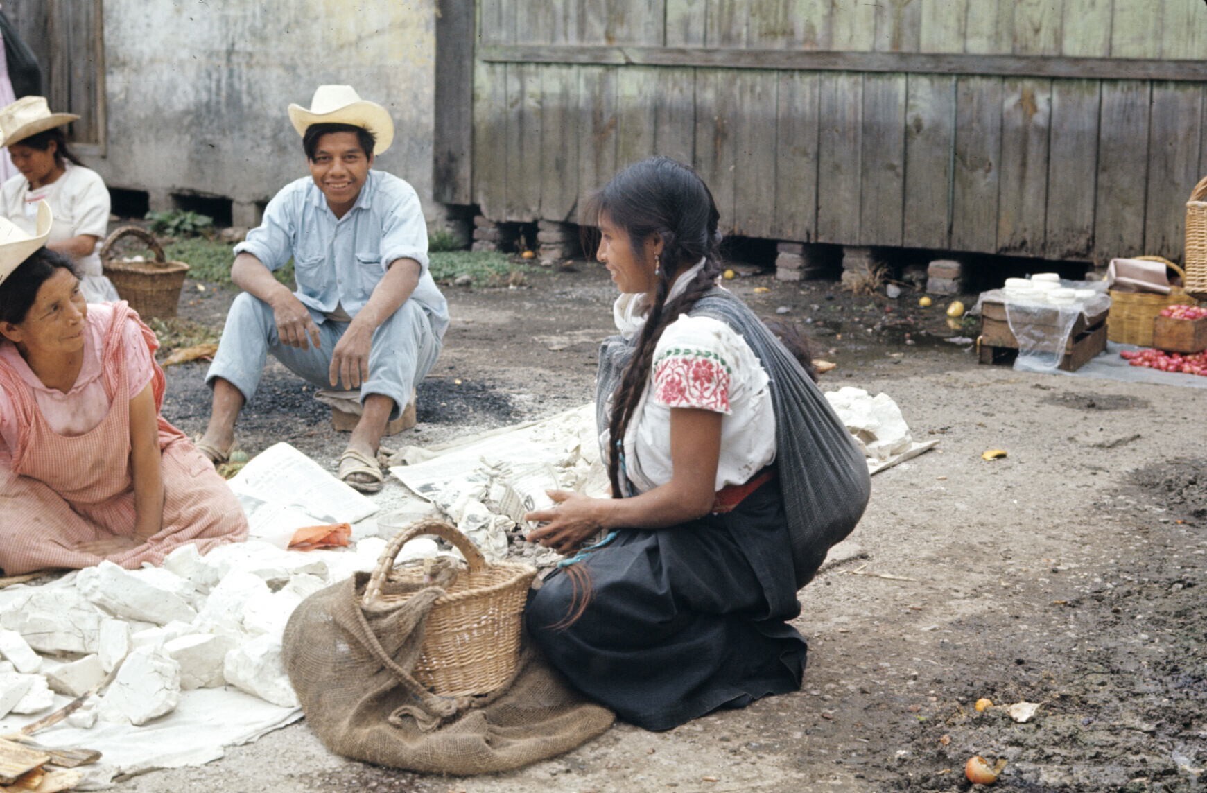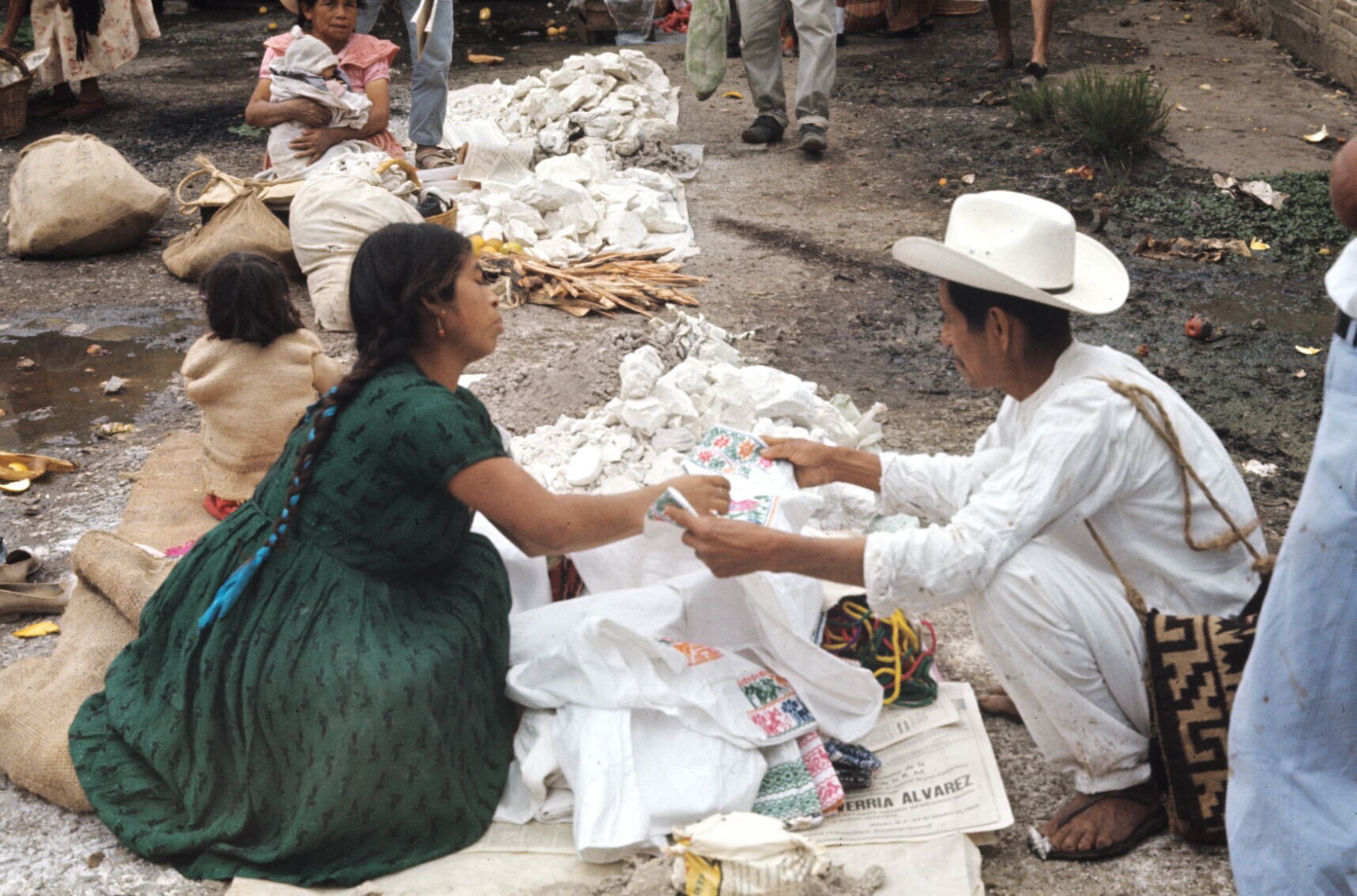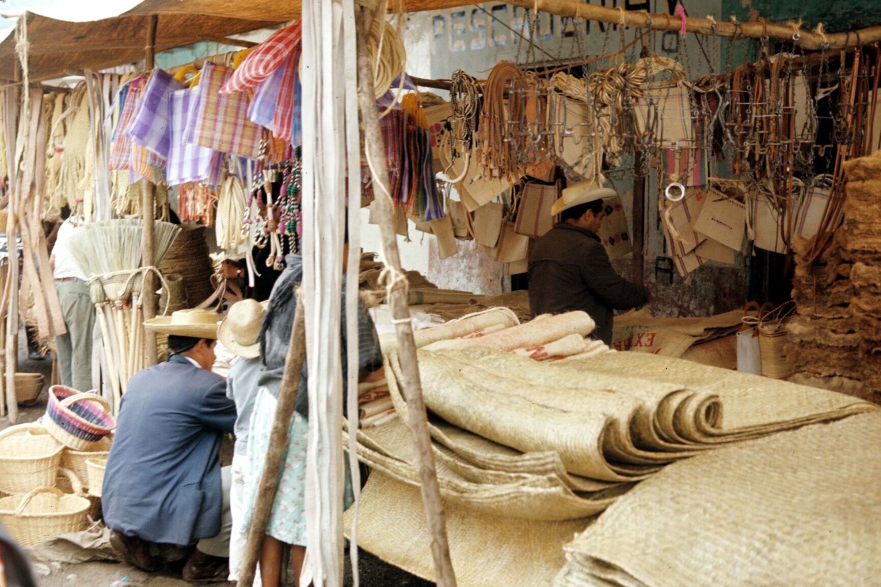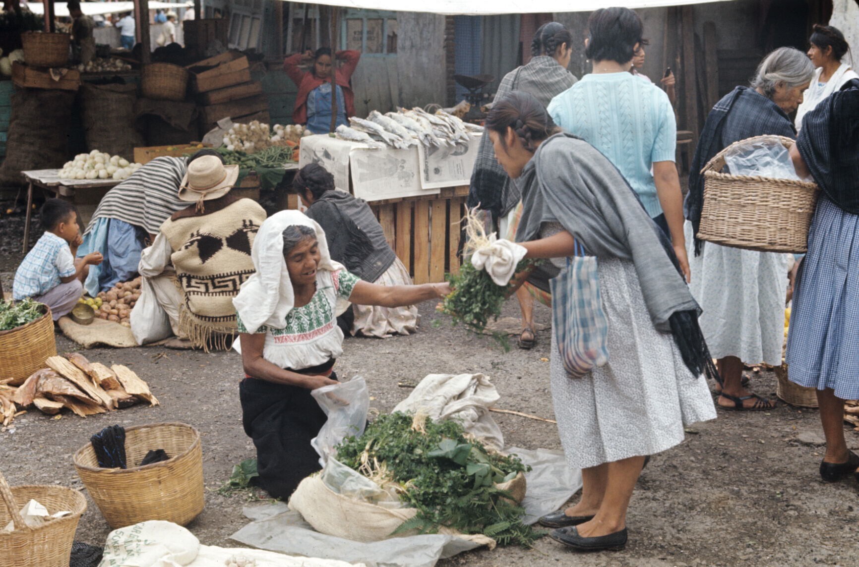 koopvrouwen op markt met 'blusas' en 'fajas' (ceintu...