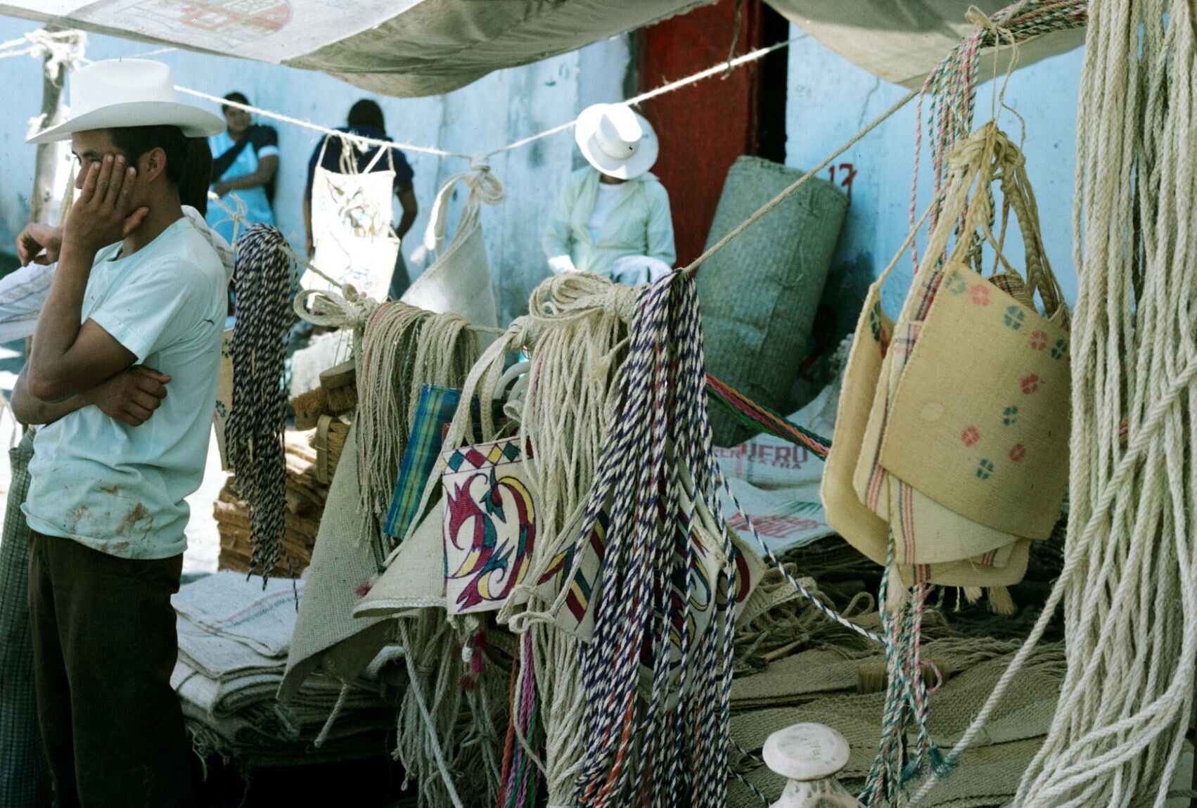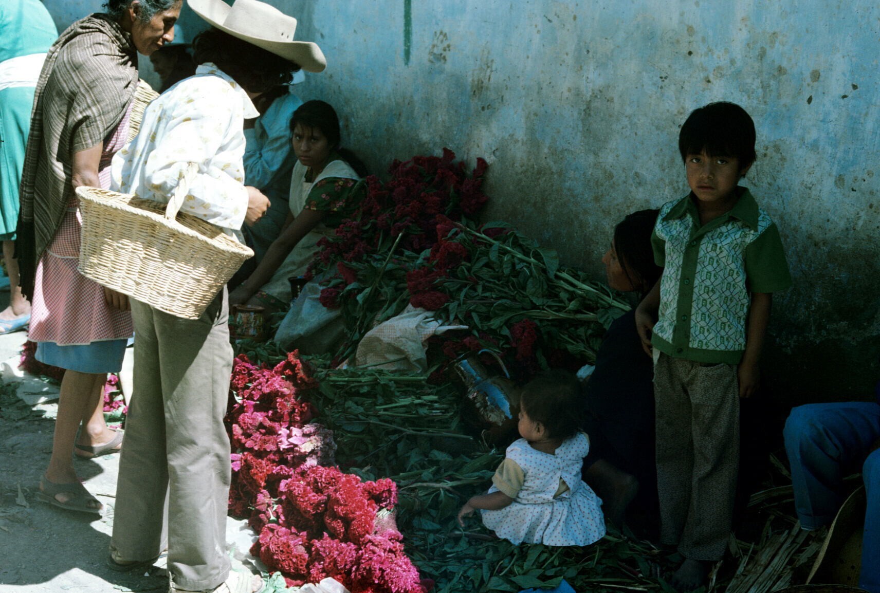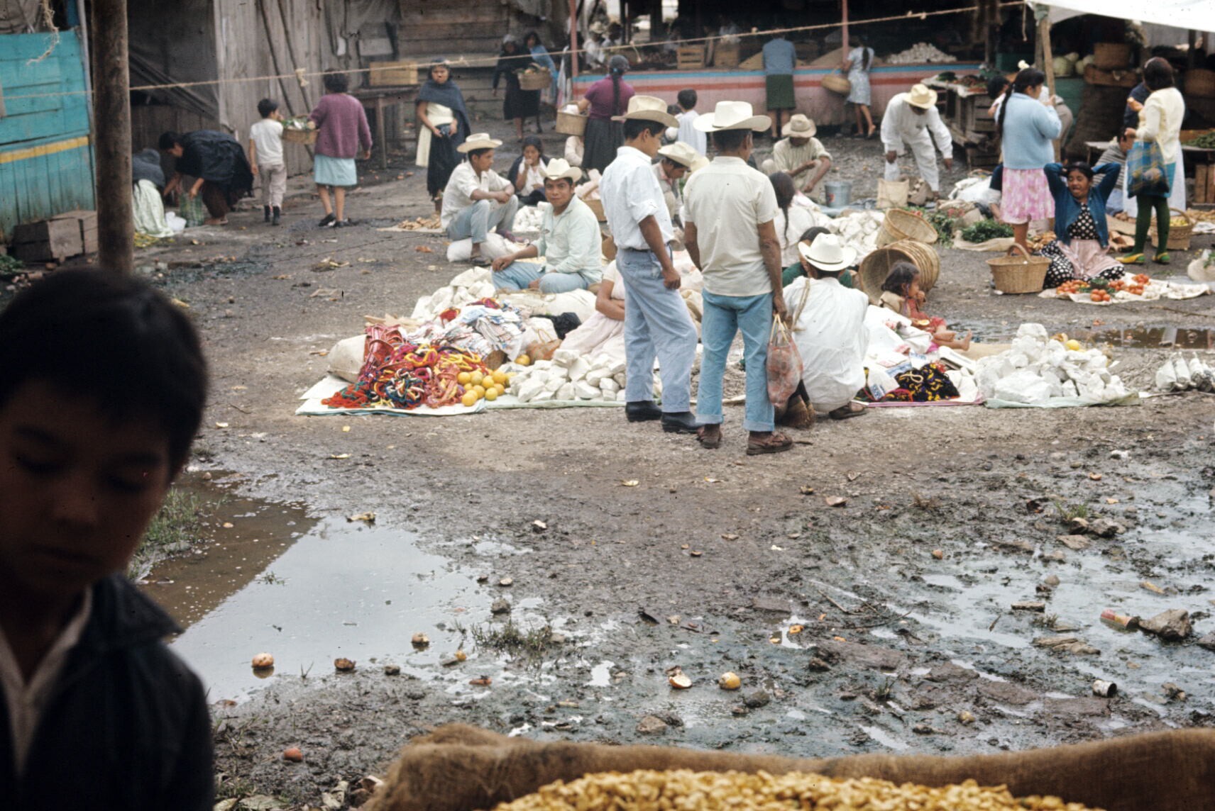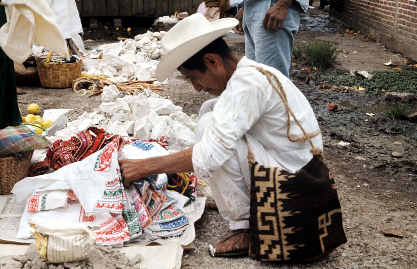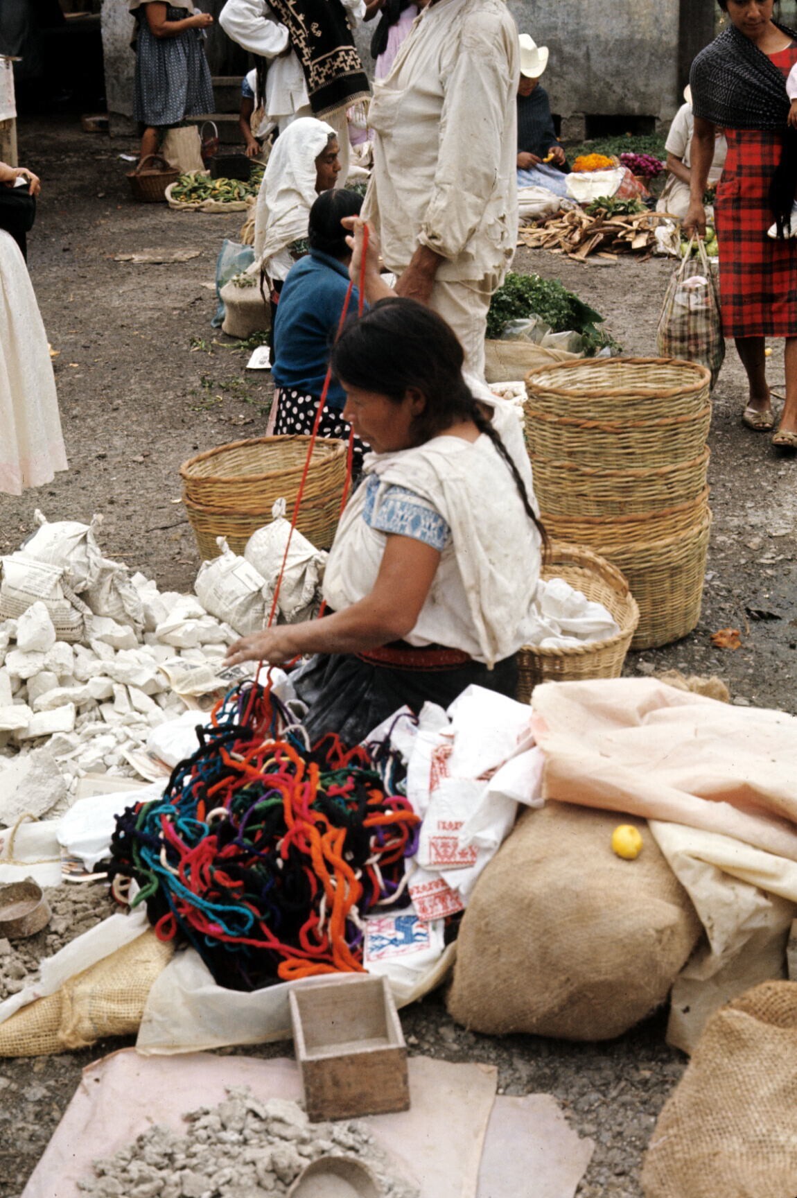 koopvrouwen op markt met 'blusas' en 'fajas' (ceintu...
