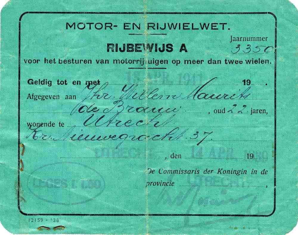 rijbewijs A op naam van Willem Maurits de Brauw, voo...