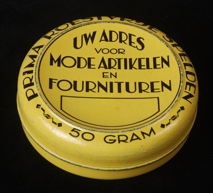 Rond geel en zwart blik, "prima roestvrije spelden"