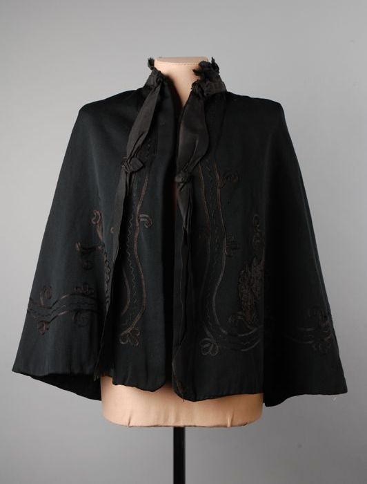 Cape van zwarte wollen keper met zwart zijde, applic...