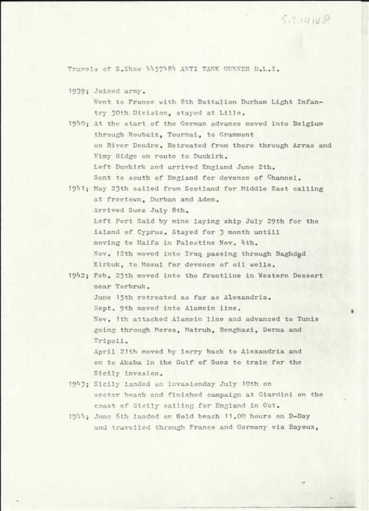 Travels of S. Shaw 4457484 anti-tank gunner Durham L...