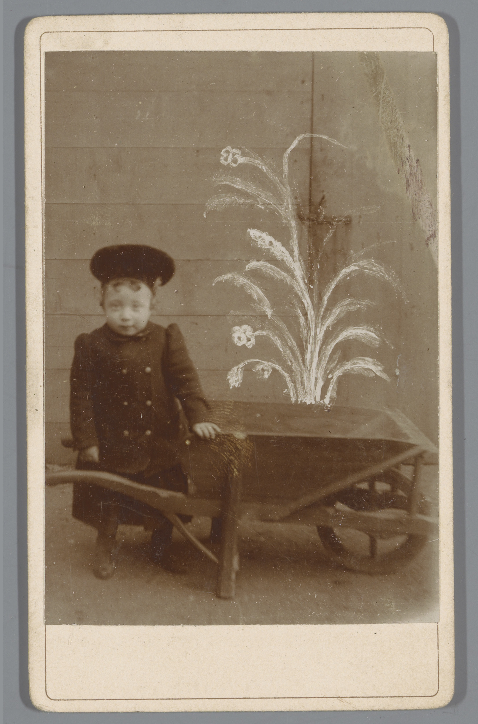 Portret van een onbekend kind bij een kruiwagen