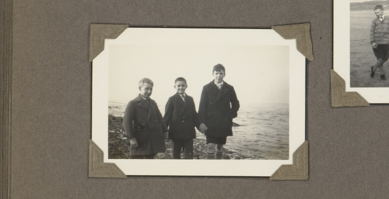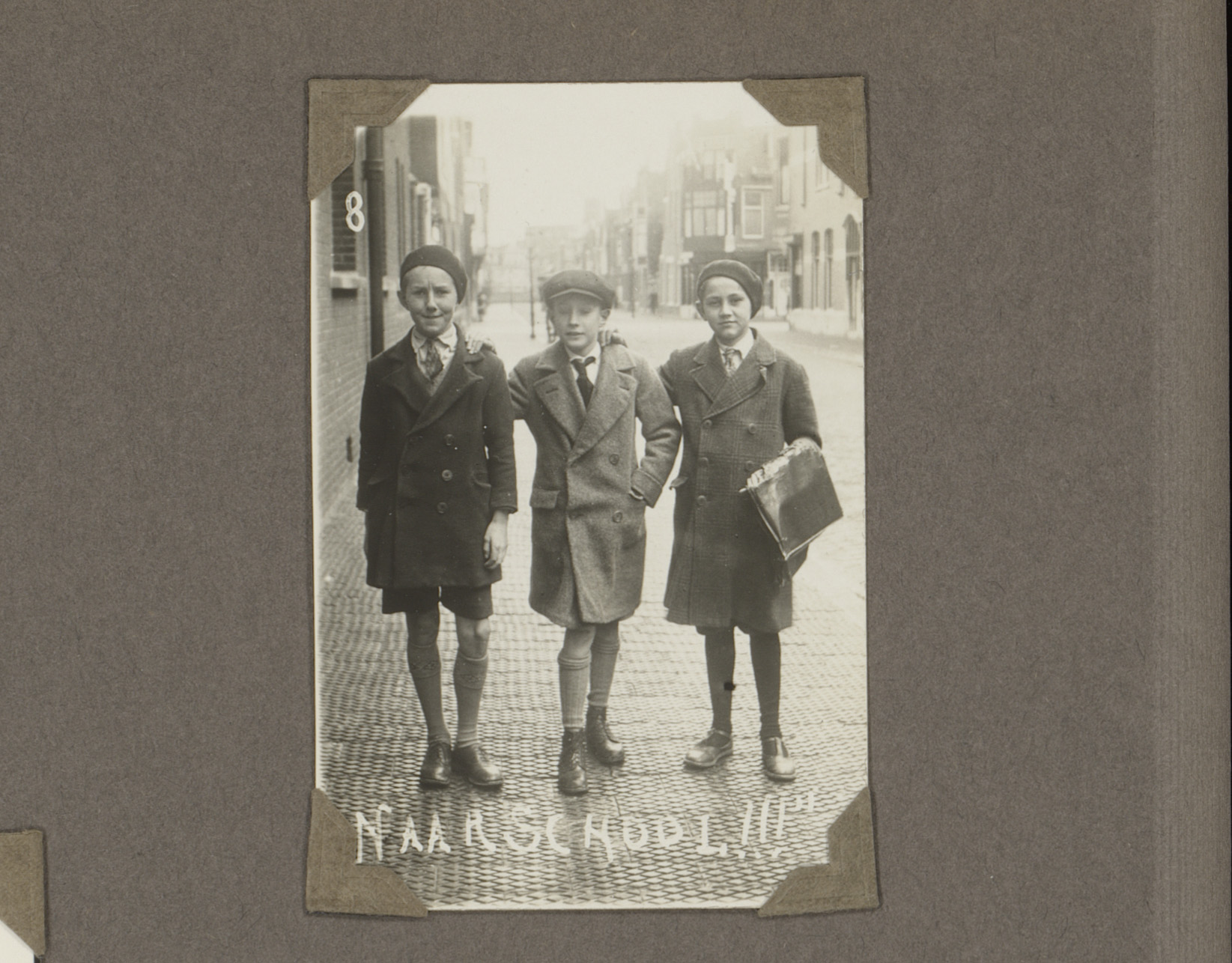 Drie jongens bij een strandpaal, twee aan weerszijde...