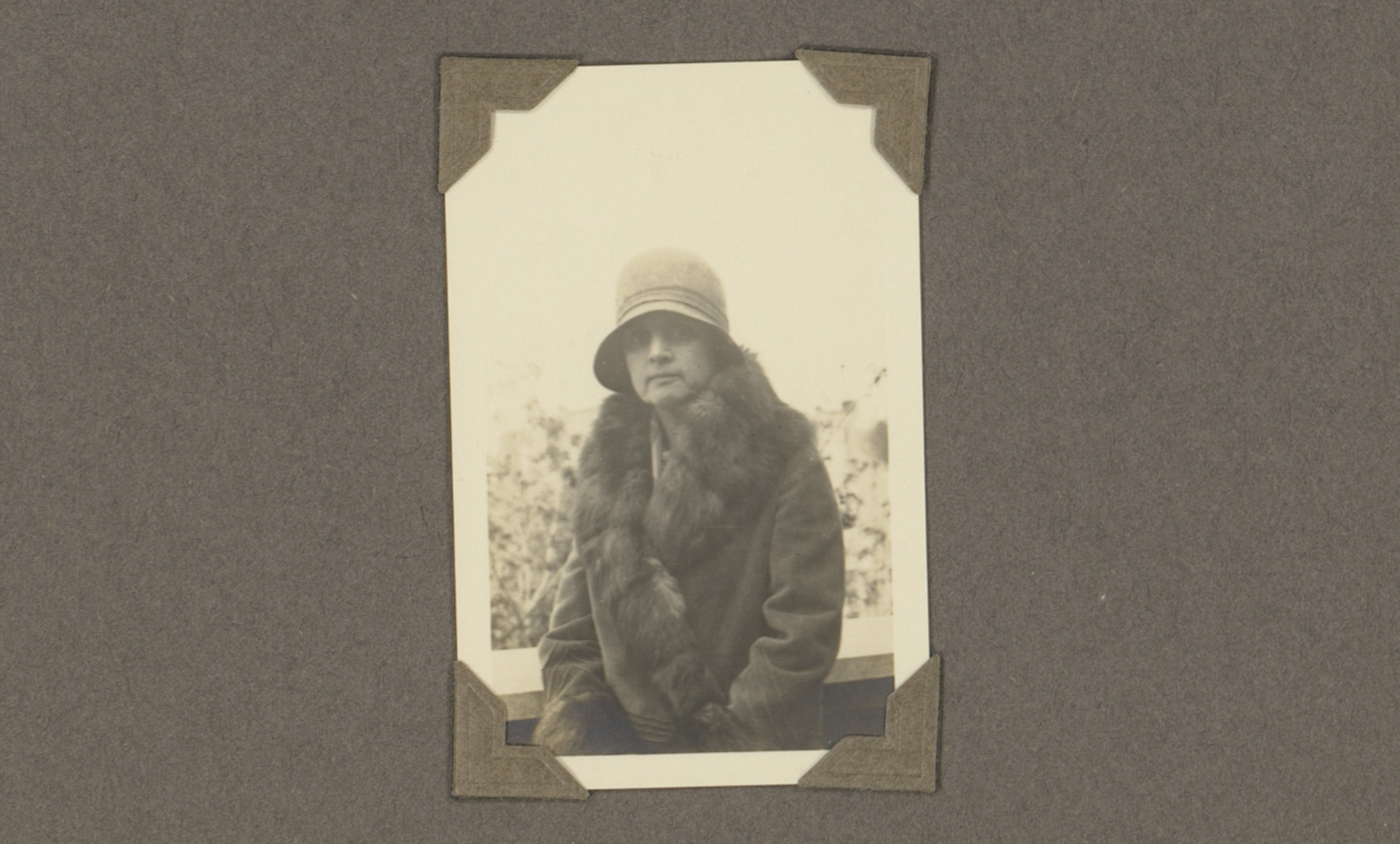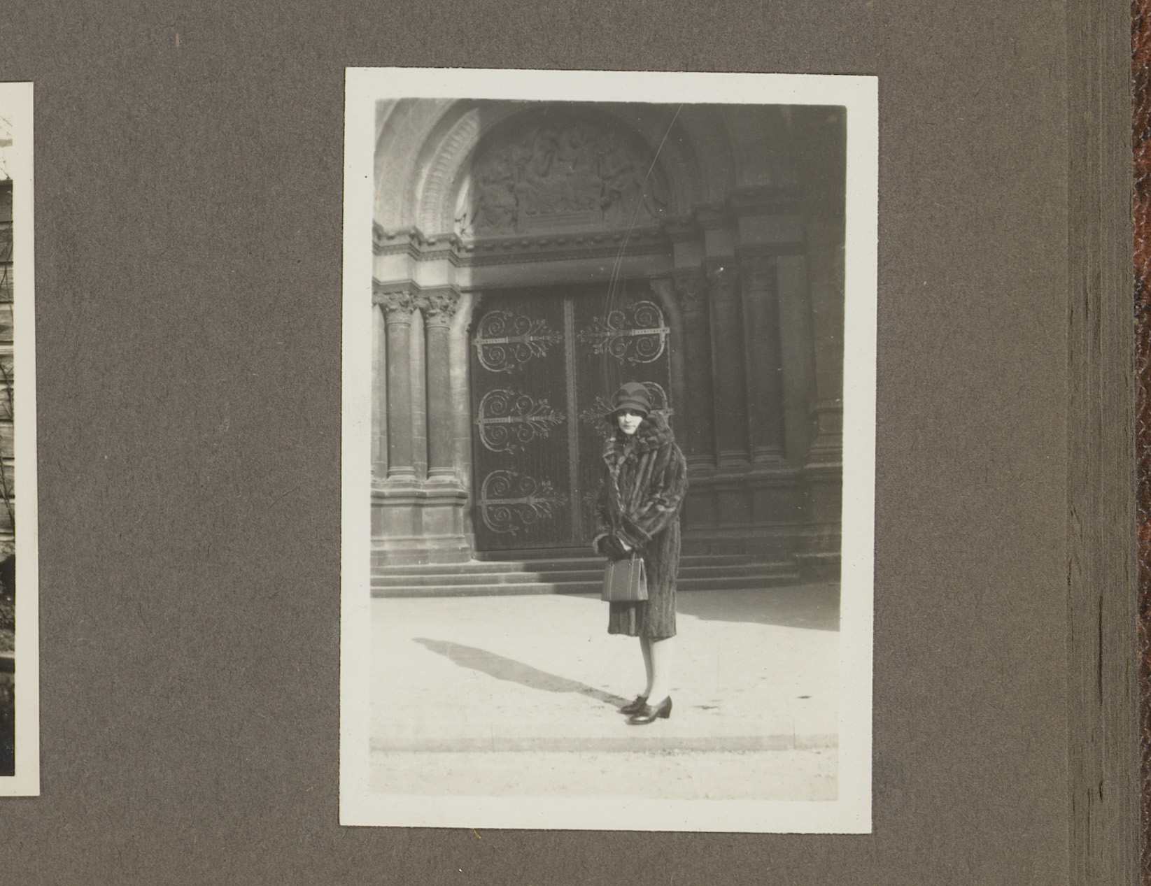 Henriëtte Wassink in een bontjas voor een kerkportaal
