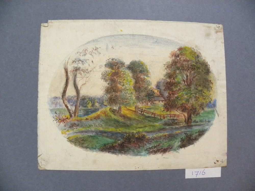 Aquarel voorstellende landschap met huis op terp, ca...