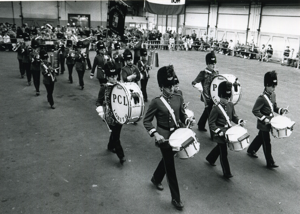 Zwart-wit foto van de drumfanfare P.C.L. te Lobith o...