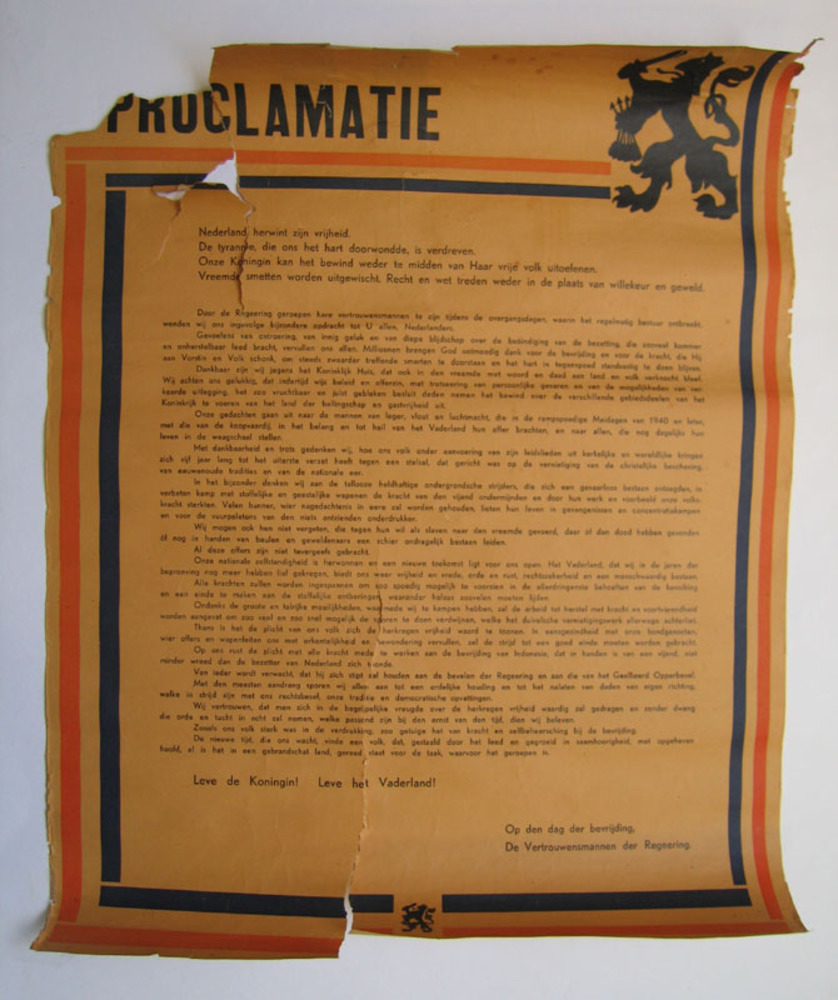 Proclamatie van de bevrijding 1945 op papier.