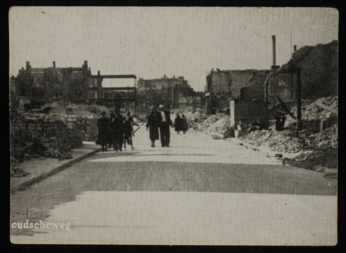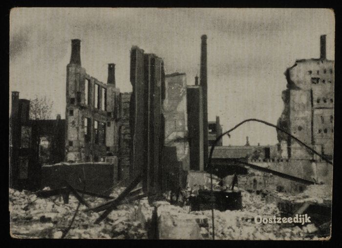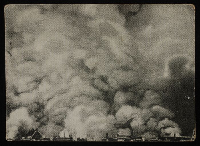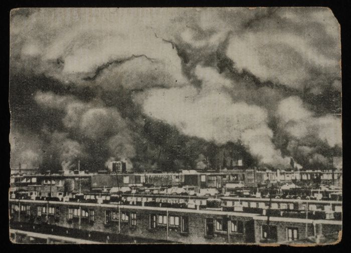 Foto van gebombardeerd Rotterdam, met dikke rookwolk...