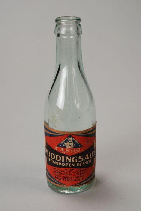 Fles puddingsaus "Cargo's", met rood etiket