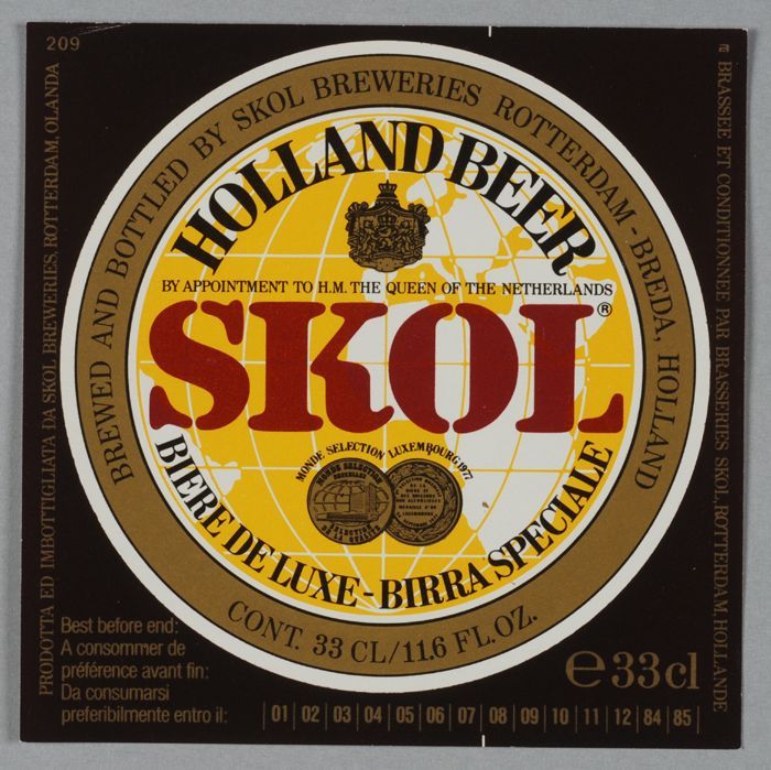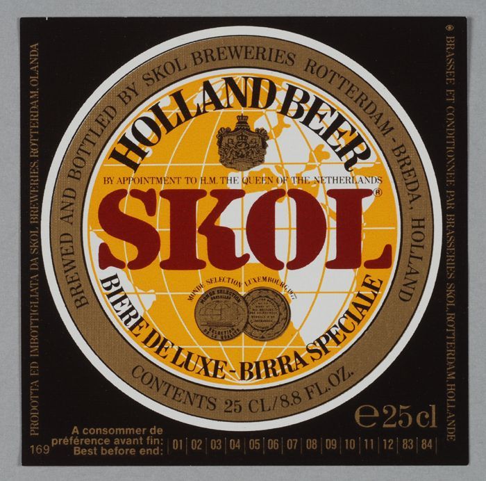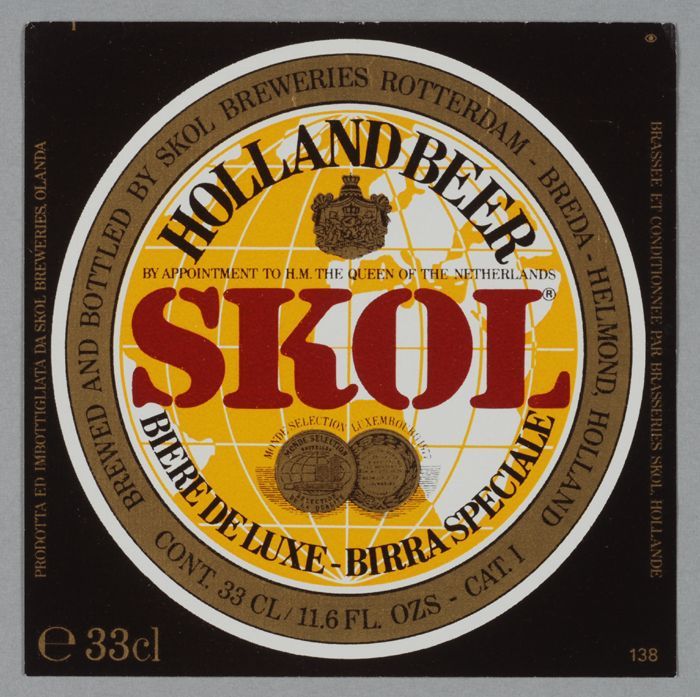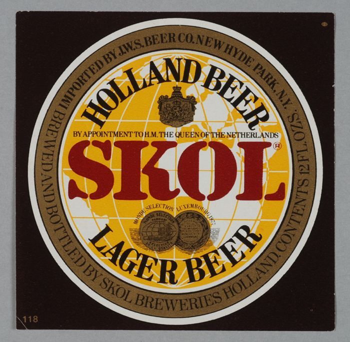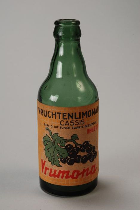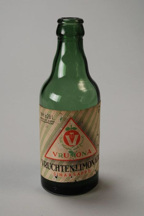 Groene limonadefles, met gekleurd etiket "Vrumona, v...