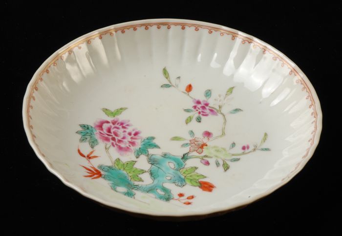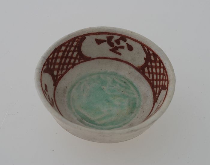 Witte kom met rood gedecoreerde rand en groen plat