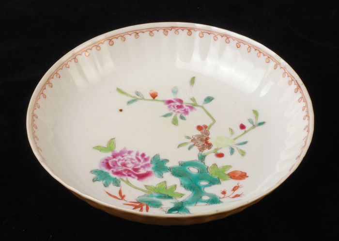 Witte schotel met in blauw, oranje en goud bloemen e...