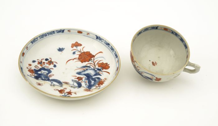 Witte kop en schotel met in blauw, oranje en goud bl...