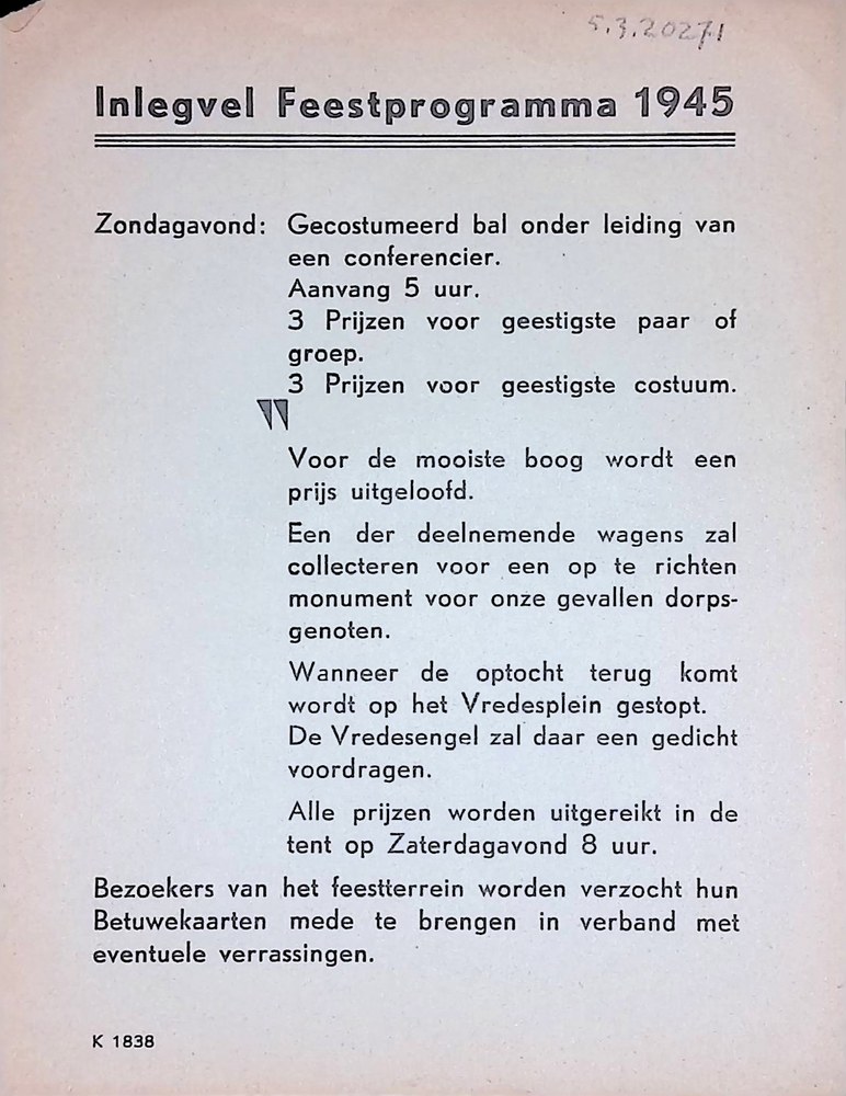 Inlegvel feestprogramma 1945. K. 1838. Het zou gaan ...