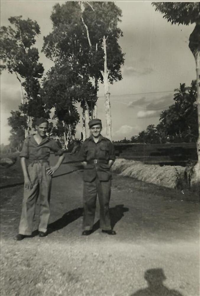 Nederlands Indië; twee militairen, weg, boom
