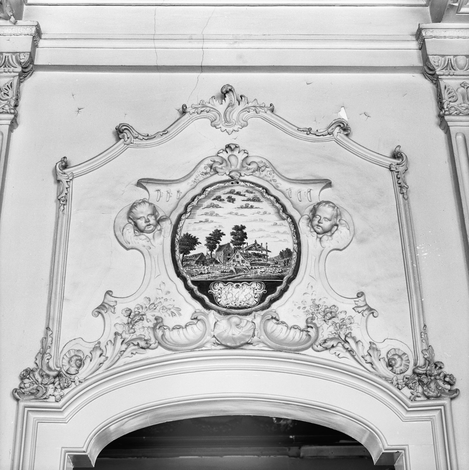Interieur hal, bovendeurstuk: stucwerk rond een kera...