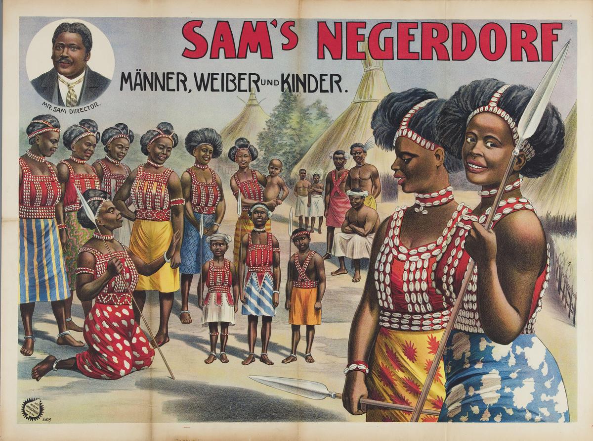 Afbeelding met tekst: "Sam's Negerdorf - Männer, Wei...