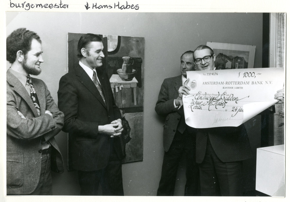 Zwart-wit foto van de overdracht van een cheque van ...