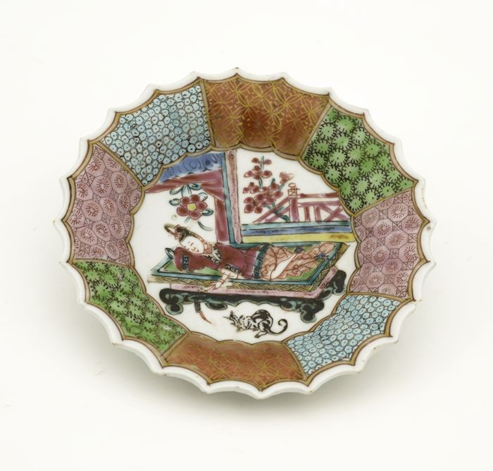 Schotel met Chinese dame op bed, poes en balustrade