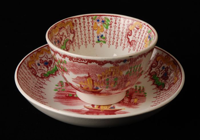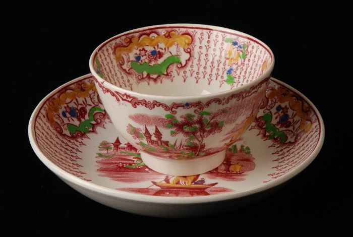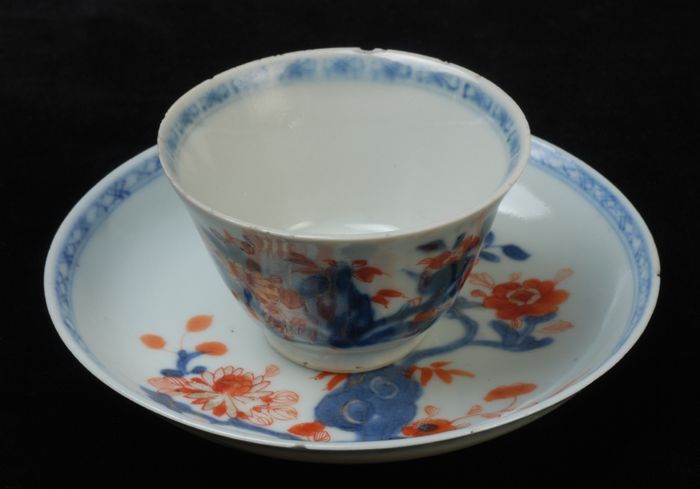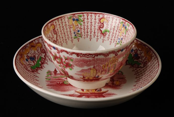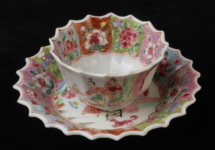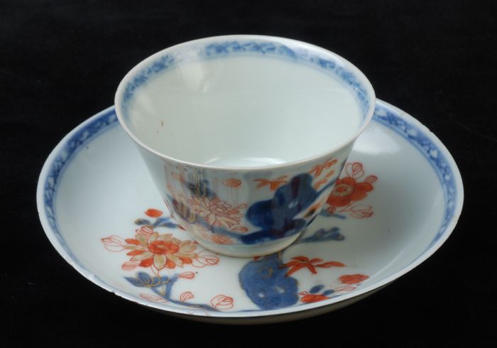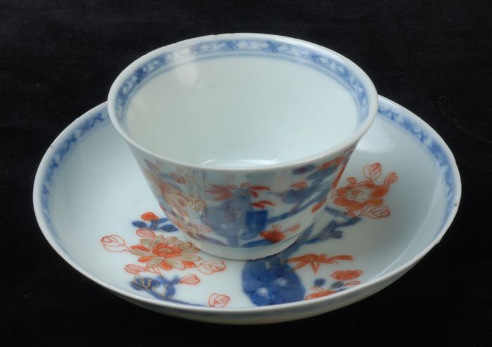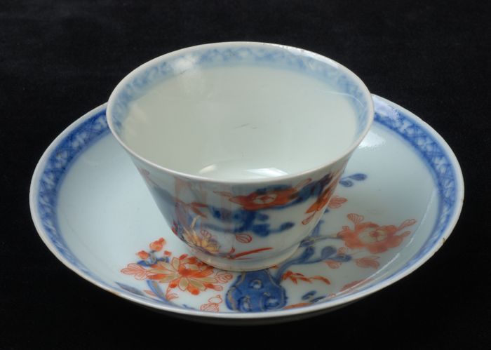 Kop en schotel met meerkleurige Aziatische bloemen e...