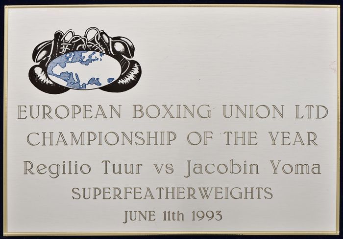 Zilverkleurige plaquette ter herinnering aan de boks...