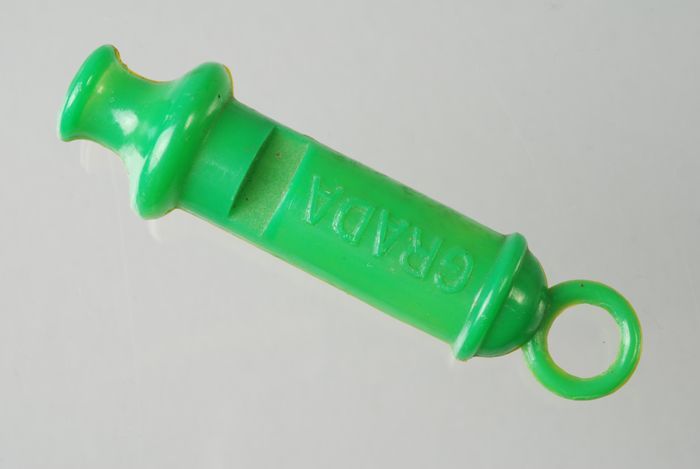 Plastic fluit met naam "Grada", groen en geel
